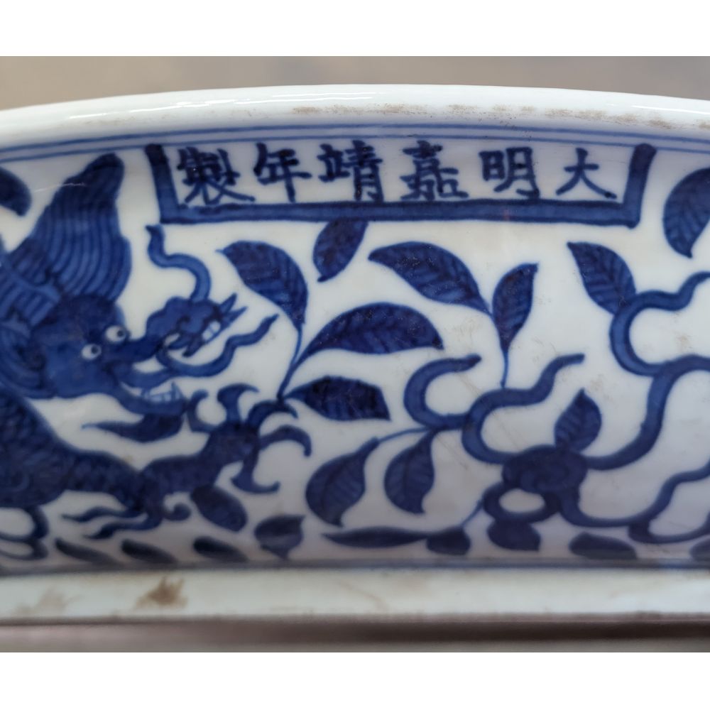 Having underglaze blue five-toed dragons amid floral scroll decoration to interior and exterior surfaces, unmarked