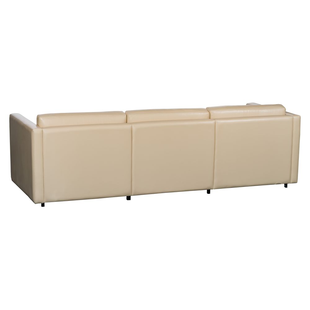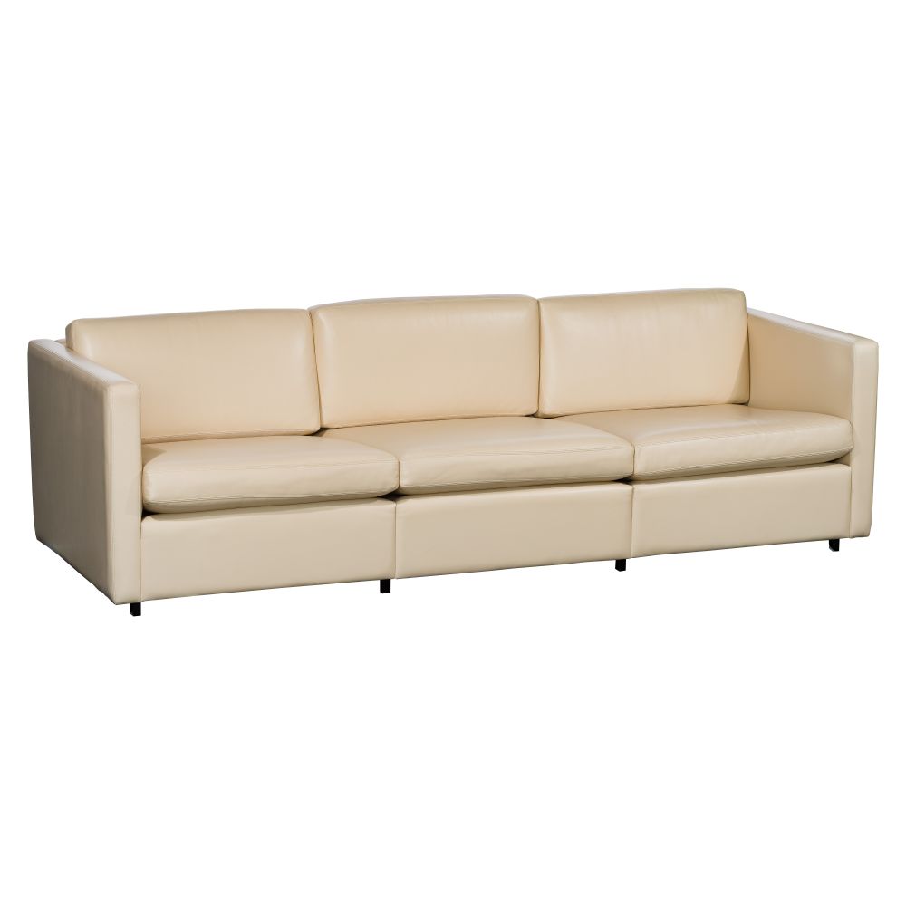 Straight-edged 3-seat frame upholstered in creamy white Volo leather, having reversible seat and back cushions