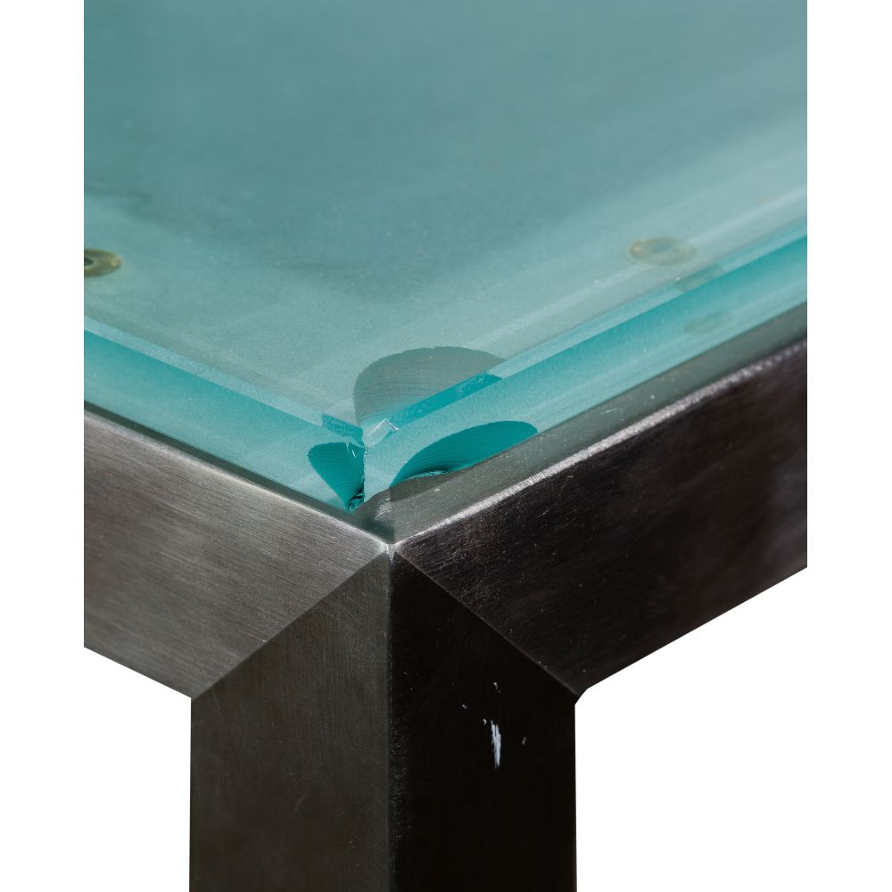 Glass top having a frosted underside, supported on brushed stainless steel square tube frame and legs