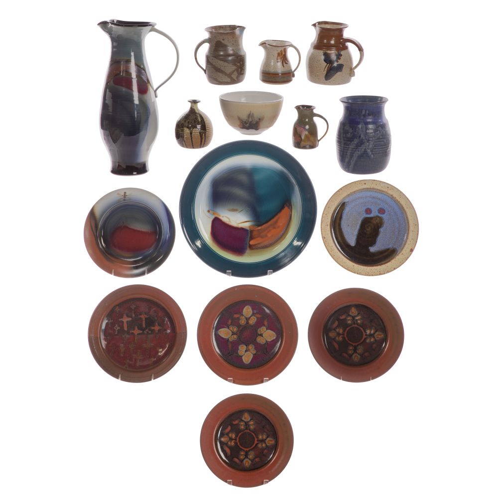 (15) items including a charger, (6) plates, a ewer, (4) pitchers, a bowl and (2) vases having various color glazes, all having incised signatures underside