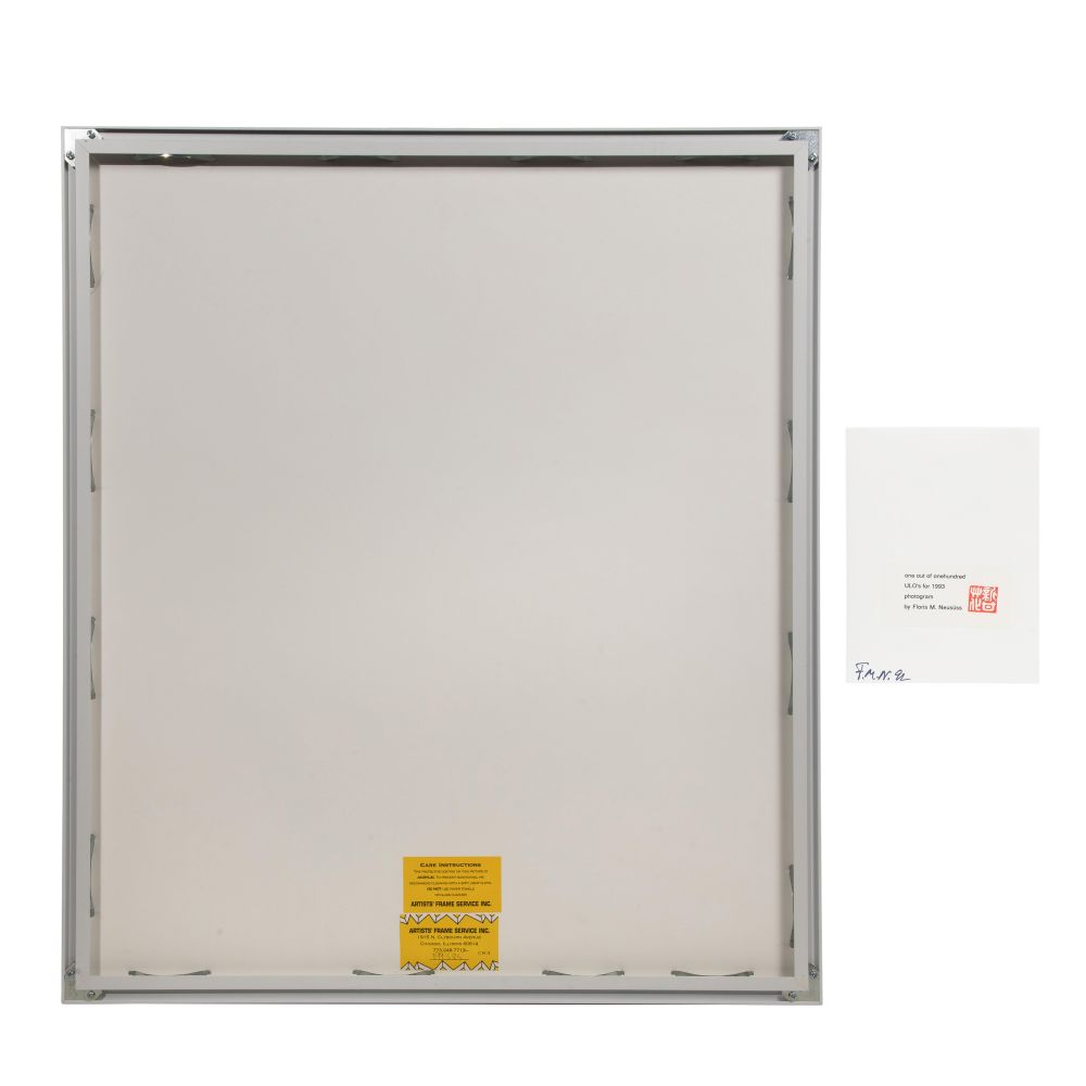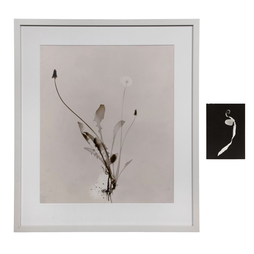 (2) items including an undated and unsigned photogram of a dandelion created without a camera by placing the object directly on a photosensitive sheet, matted behind acrylic in a painted metal frame, and a 5.75 x 4-inch photogram initialed in ink and having a printed label verso, reading “one out of one hundred / ULO’s for 1993 / photogram / by Floris M. Neususs” alongside a red chopmark, in an envelope having the artist’s information