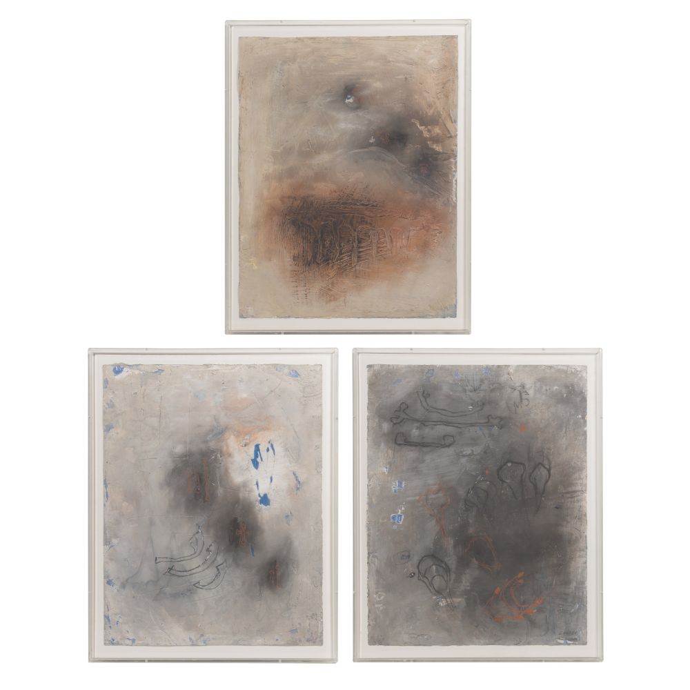 (3) items, undated and unsigned, acrylic and mixed media, each having Germans Van Eck Gallery, New York labels verso giving artist, title and date, all titled “Structure Series 15” 1990 and forming a suite, full sheets uniformly float mounted on backing behind acrylic box frames