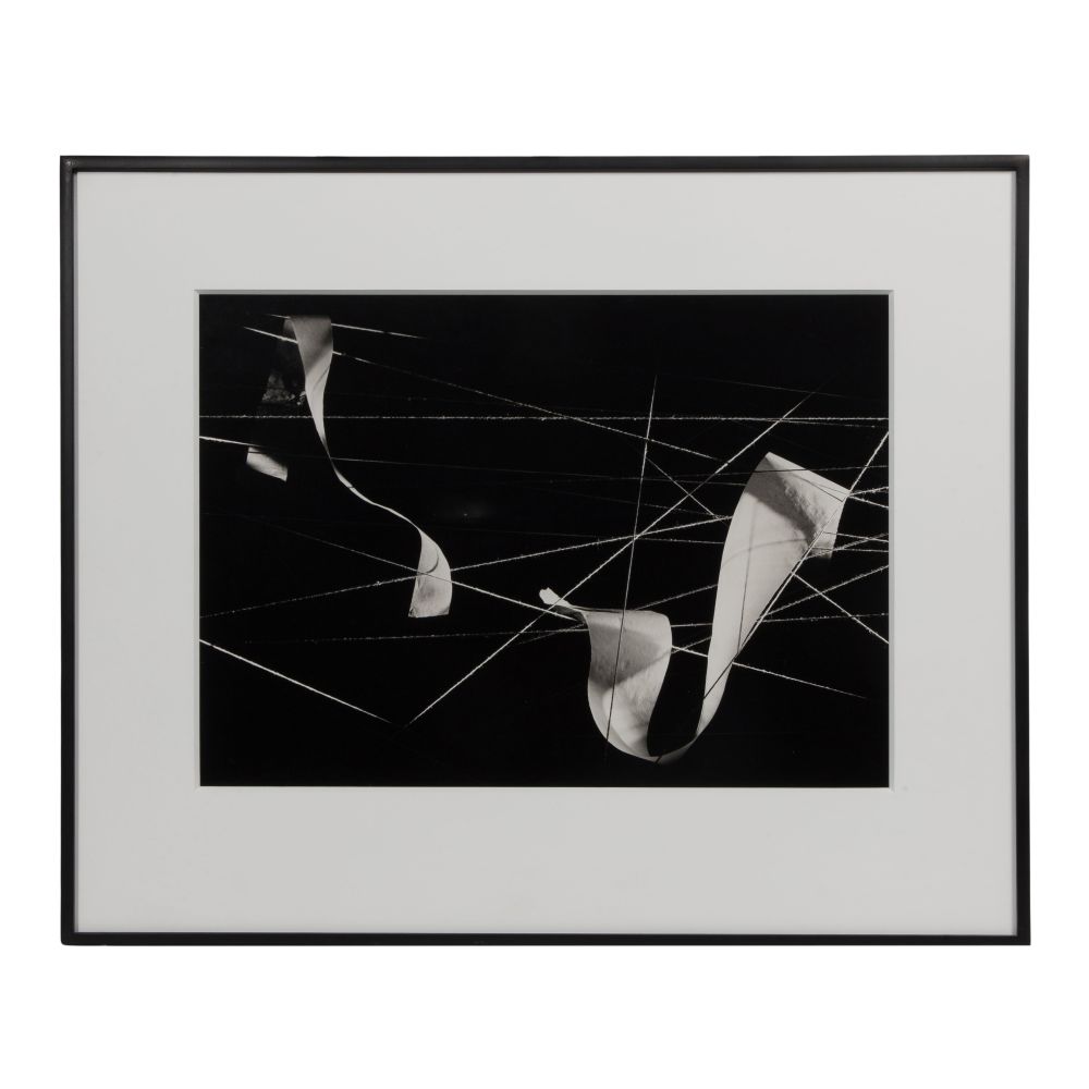 Undated and unsigned, an abstract composition of ribbons of paper draped on a network of taut strings from the 1938 portfolio “Nathan Lerner: Fifteen Photographs”, matted behind glass in a painted metal frame