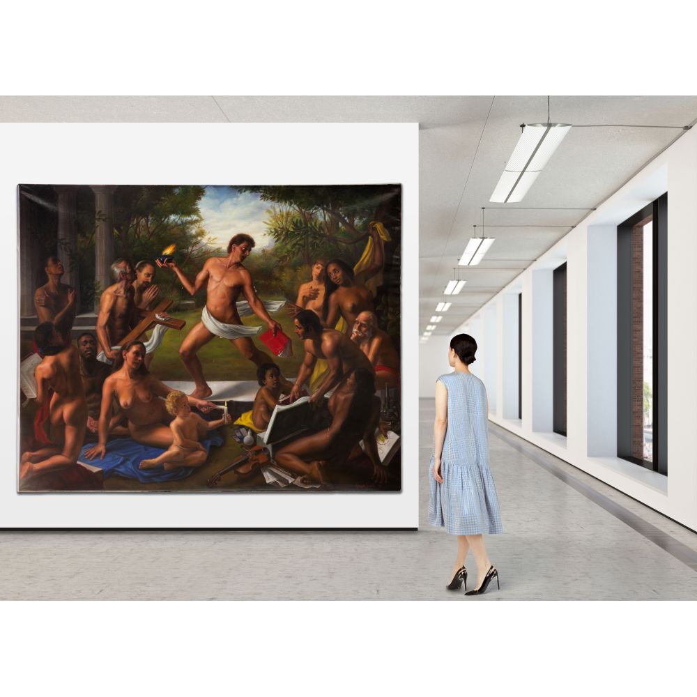 1996, signed lower right, dated and signed on reverse of stretcher, allegorical depiction of a minimally clad central figure carrying a lamp and book having a circle-in-a-square emblem on its cover, surrounded by various nude figures holding objects of religious or philosophical significance, unframed