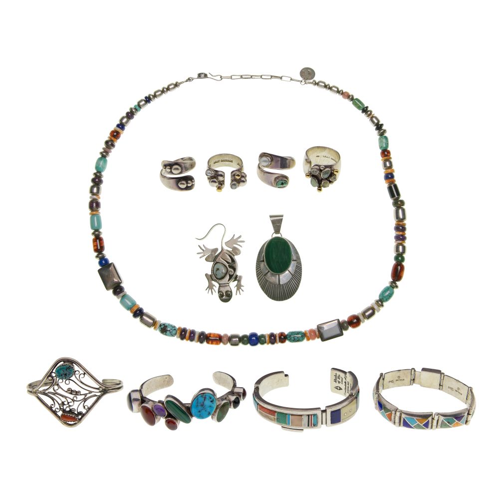 (11) items including a Bennie Raton lizard form pin, (4) Lily Barrack rings, a David N. Begay bracelet and pendant, a Christin Wolf beaded necklace, a Teme hinged bracelet, a Beg filigree bracelet and Nakai semi-precious stone bracelet (all marked “925” / “sterling”)