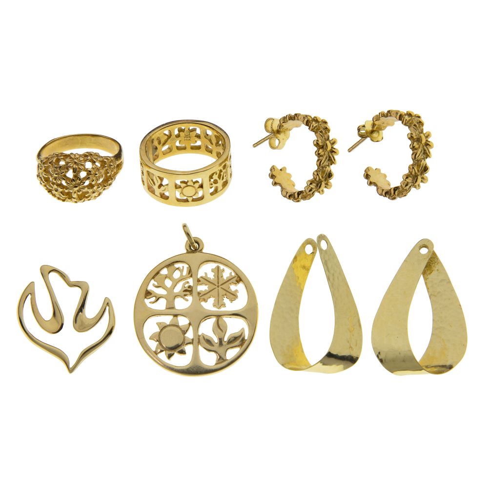 (6) items including a four seasons themed pendant and ring, a stylized dove form pendant, a floral motif ring and pierced earrings as well as a matched set of modern design earring jackets (all marked “14k”)