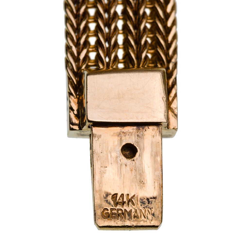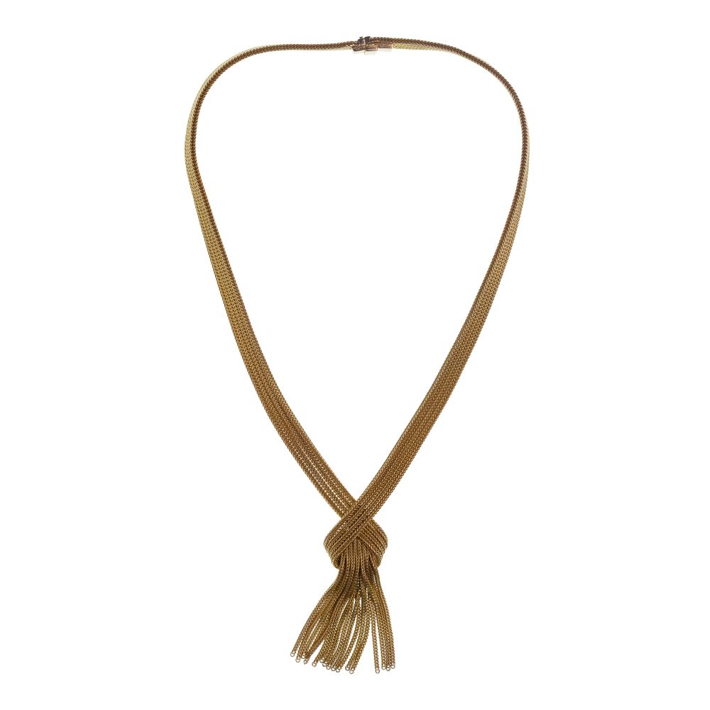 Four herringbone mesh necklace overlapping to a chain fringe, 0.375-inch wide (marked “14k” on tongue of clasp)