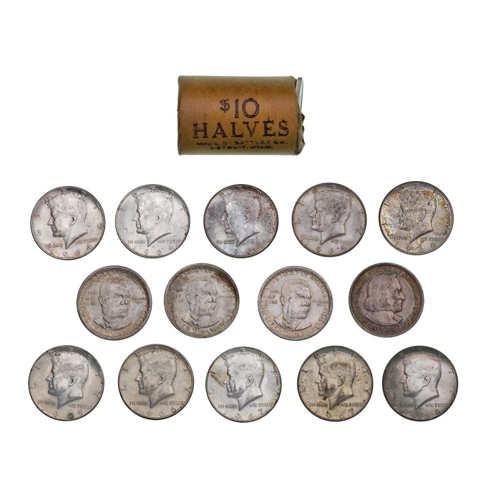 $14.00 face value US 90% silver including (25) Kennedy 50c, (3) Booker T. Washington 50c and a Columbus 50c as well as $2.50 face value US 40% Kennedy 50c