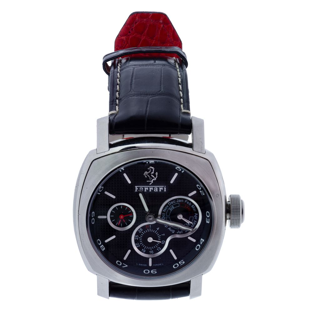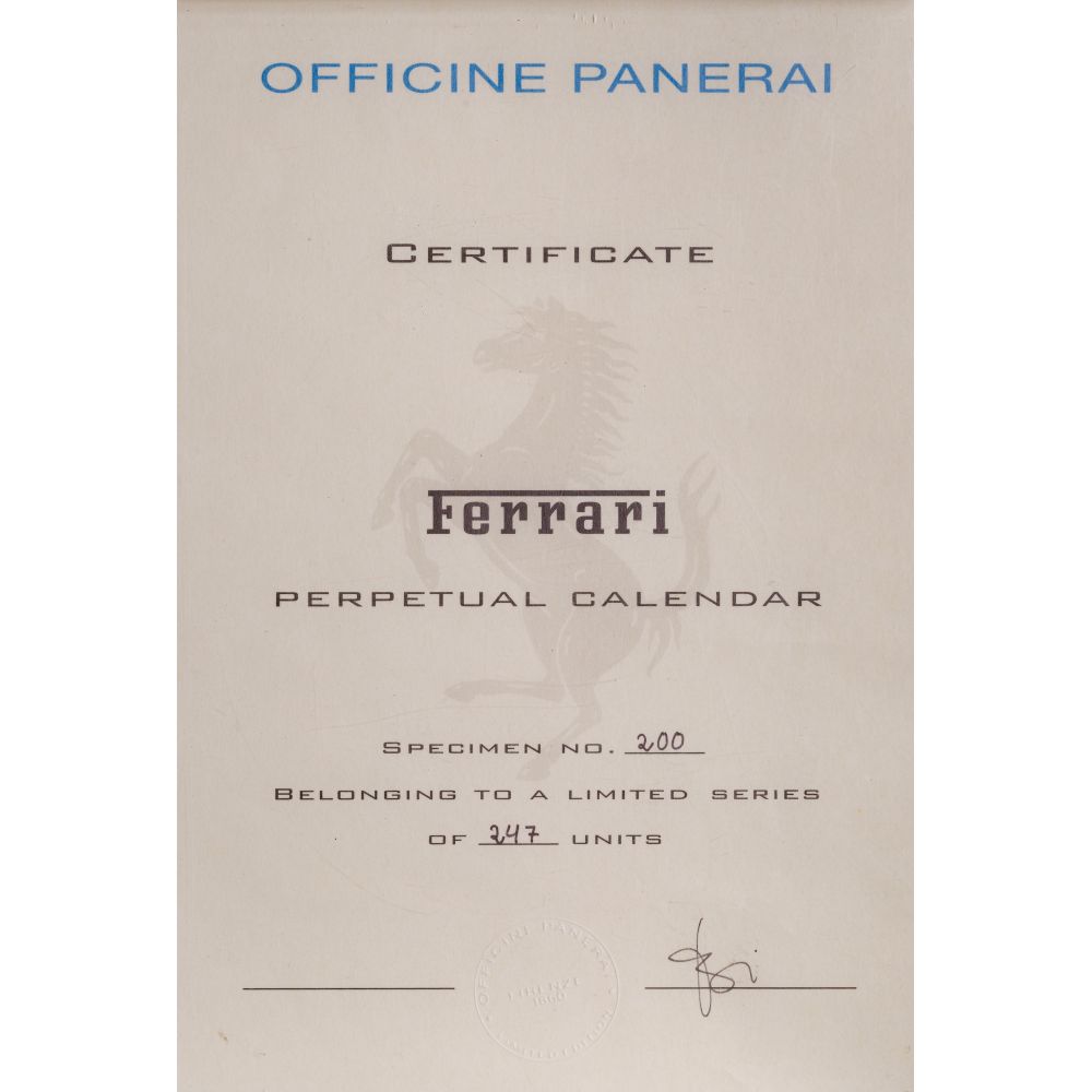 Serial #BB1261452, ref #FER00015, special edition #200 / 247, automatic having three sub-dials at 3, 6 and 9 o’clock, perpetual calendar, mechanical movement, illuminated hands, black dial, stainless steel case on a black leather straps with deployment buckle, COA and original box and presentation box