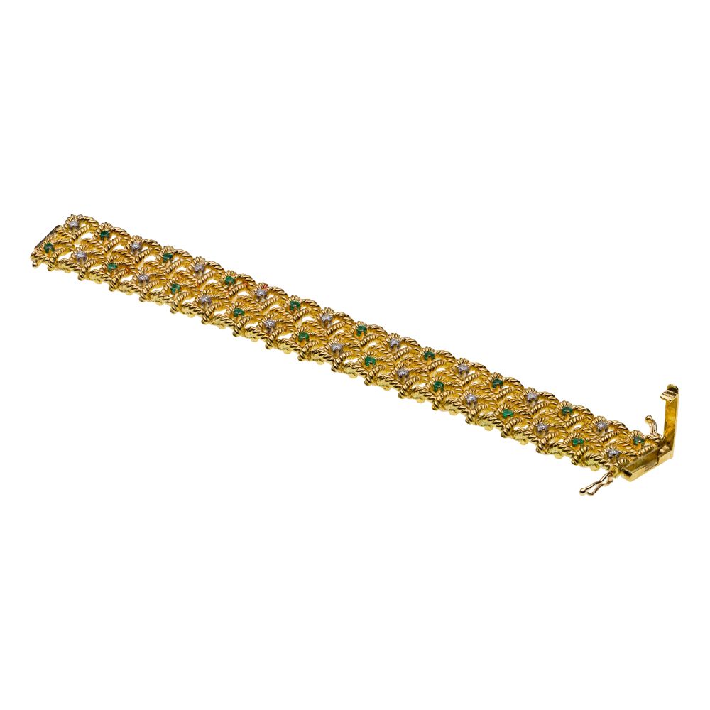 3/4-inch wide basket weave bracelet set with eighteen round brilliant cut diamonds (average 2.45mm) weighing approximately 1.0 carat, H-I color, VS-SI clarity and eighteen round brilliant cut emeralds (average 2.4mm) (marked “18k” on tongue of clasp)