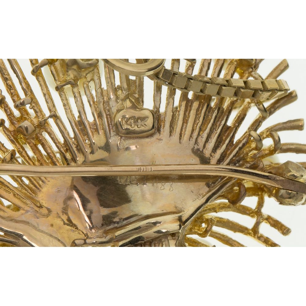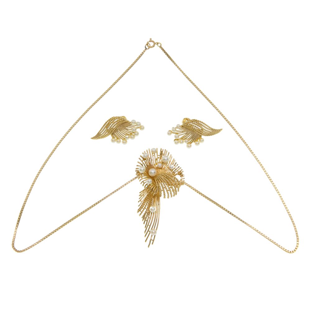 (2) items including a firework motif pendant / brooch having randomly placed pearls of graduated sizes on a necklace and a pair of matching clip-on earrings (all marked “14k”)