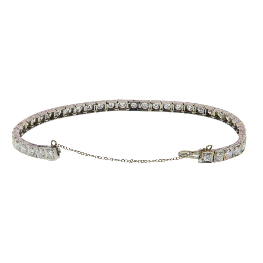 Straight line bracelet having forty-one brilliant cut diamonds, approximately 4.92 carats total weight, H/I color, VS to SI clarity, platinum mount decorated with chasing