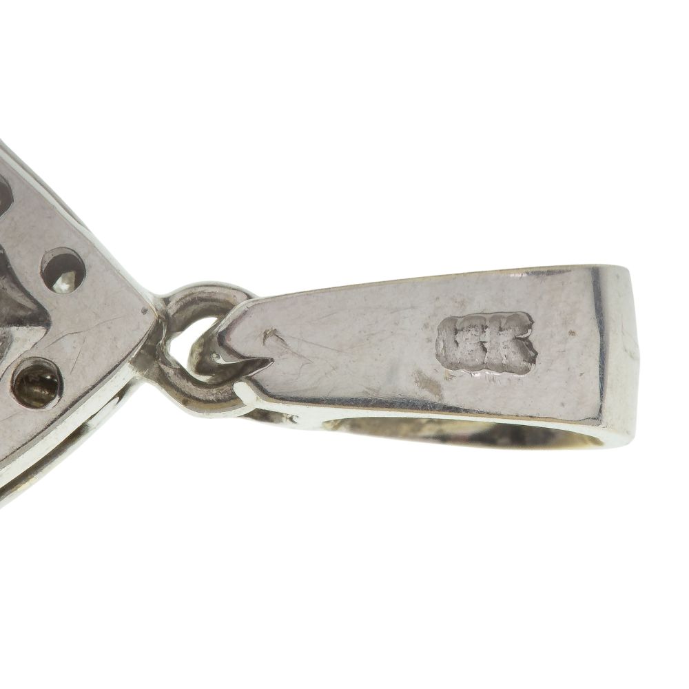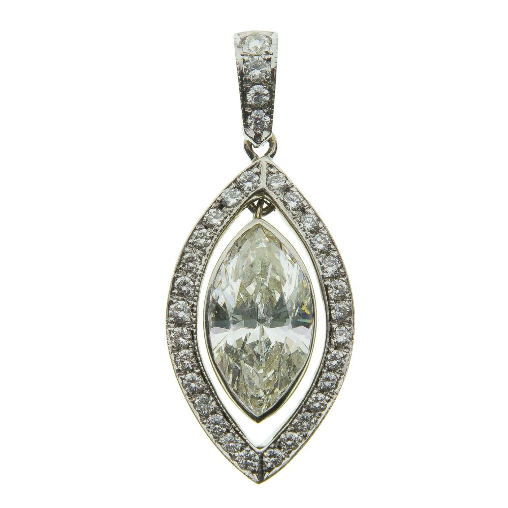 Diamond pendant set with a marquise cut diamond weighing approximately 3.87 carats (15 x 8 x 4.82mm) in a swing mount, J color, SI-2 clarity, strong blue fluorescence, mount further set with thirty-two round brilliant cut diamonds measuring 1.7mm each (marked “18k”)