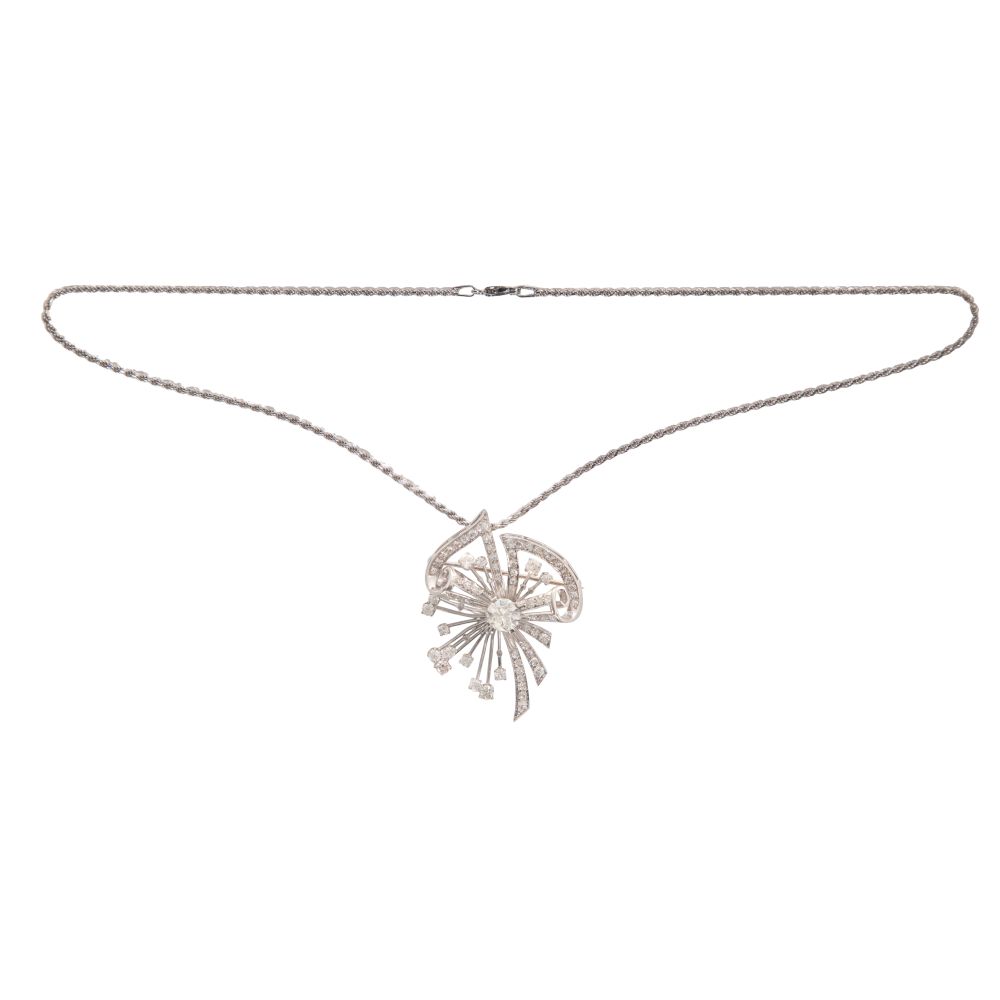Platinum, 14k White Gold and Diamond Brooch / Pendant on 14k Necklace