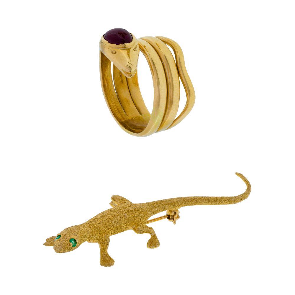 Condition: overall light wear consistent with normal uses, ruby having natural fissure / crack, ring XRF tested as 18k gold, lizard unmarked but XRF tested as 14k gold, overall light wear consistent with normal uses, ruby having natural fissure / crack, ring XRF tested as 18k gold, lizard unmarked but XRF tested as 14k gold