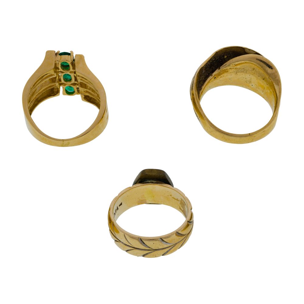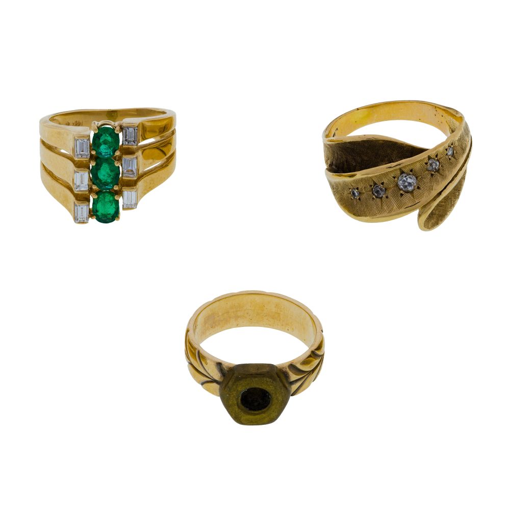 (3) rings including a wave-form having five graduated round cut diamonds, a multi-band-style having three oval cut emeralds flanked by six baguette cut diamonds and a band having a brass nut attached (all marked “14k”)