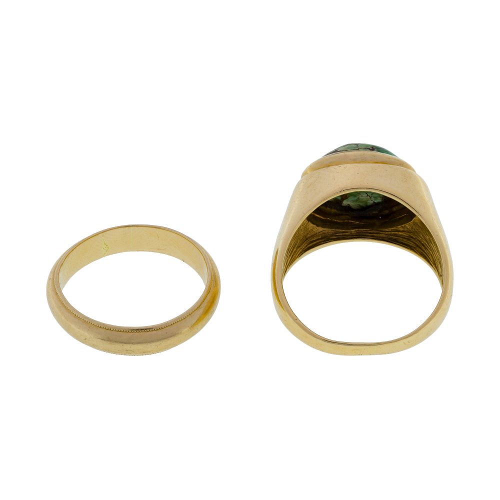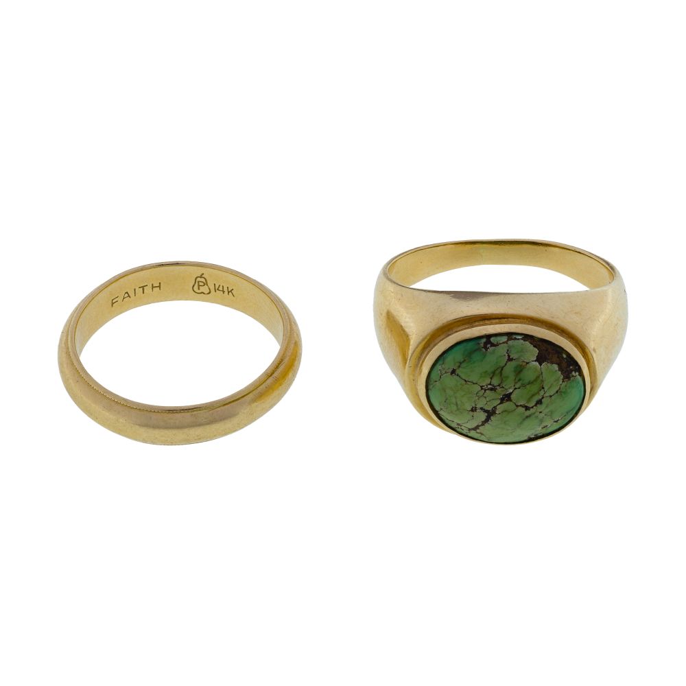 Condition: overall light wear consistent with normal use, band having the word FAITH stamped inside, turquoise unmarked but XRF tested as 14k gold and shank slightly bent, overall light wear consistent with normal use, band having the word FAITH stamped inside, turquoise unmarked but XRF tested as 14k gold and shank slightly bent