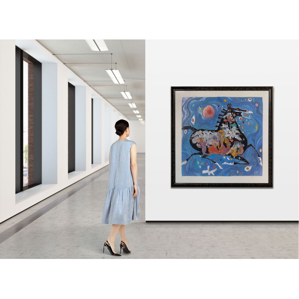 1987, signed, depicting abstract women inside a black horse, float mounted within a black lacquer wood frame
