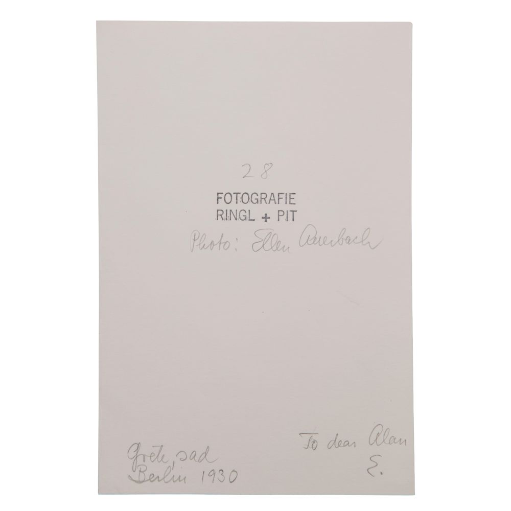 Undated, pencil signed verso below the rubber stamped “Fotographie / Ringl + Pit” (childhood nicknames of Grete Stern “Ringl” and Ellen Auerbach “Pit”), pencil notations “Grete, Sad / Berlin 1930” lower left and “To Dear Alan E.” lower right