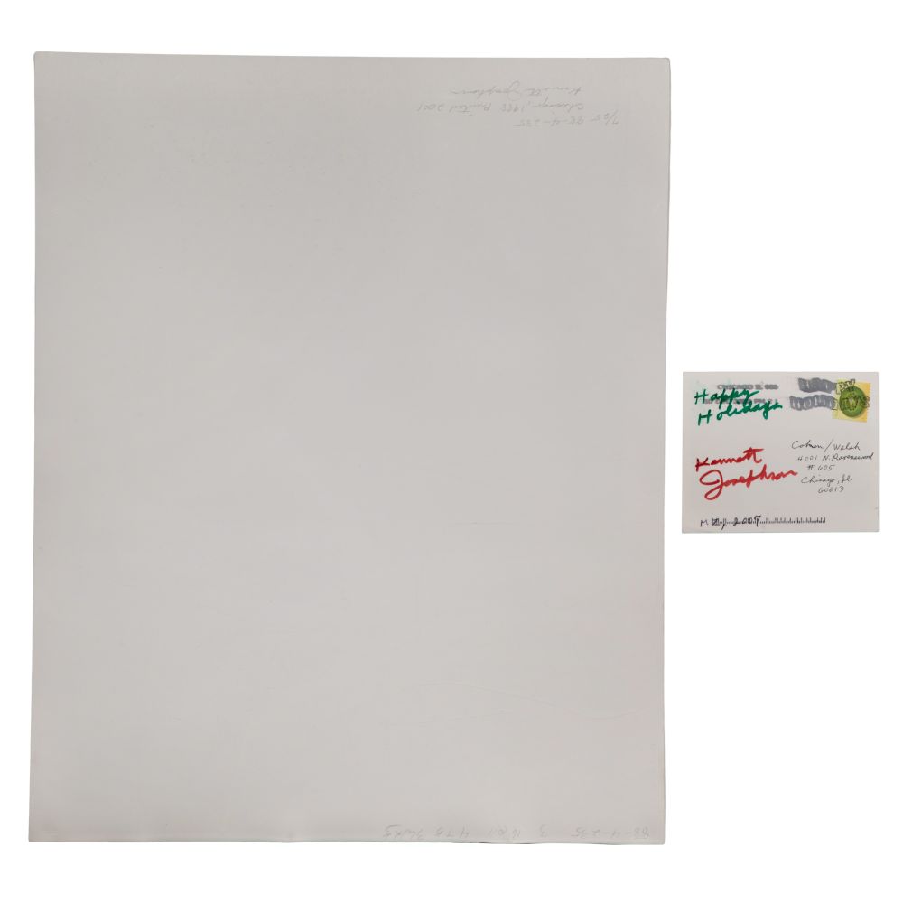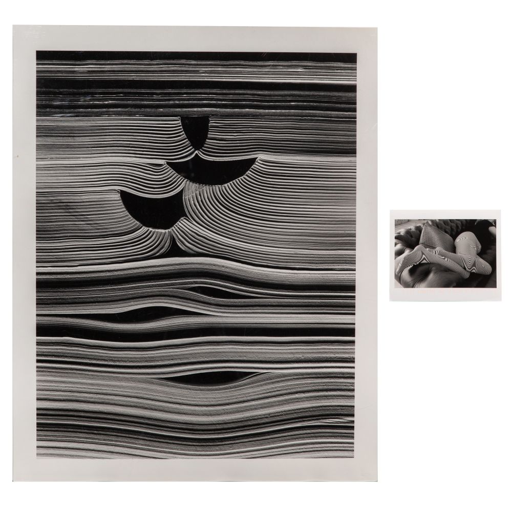(2) items including “Chicago (88-4-235)” pencil signed, #7/25 verso, 2001 printing of the 1988 image of stacked open books and a real photo greeting card from the photographer, ink signed and dated 2007, depicting a woman in Op Art tights, both unframed