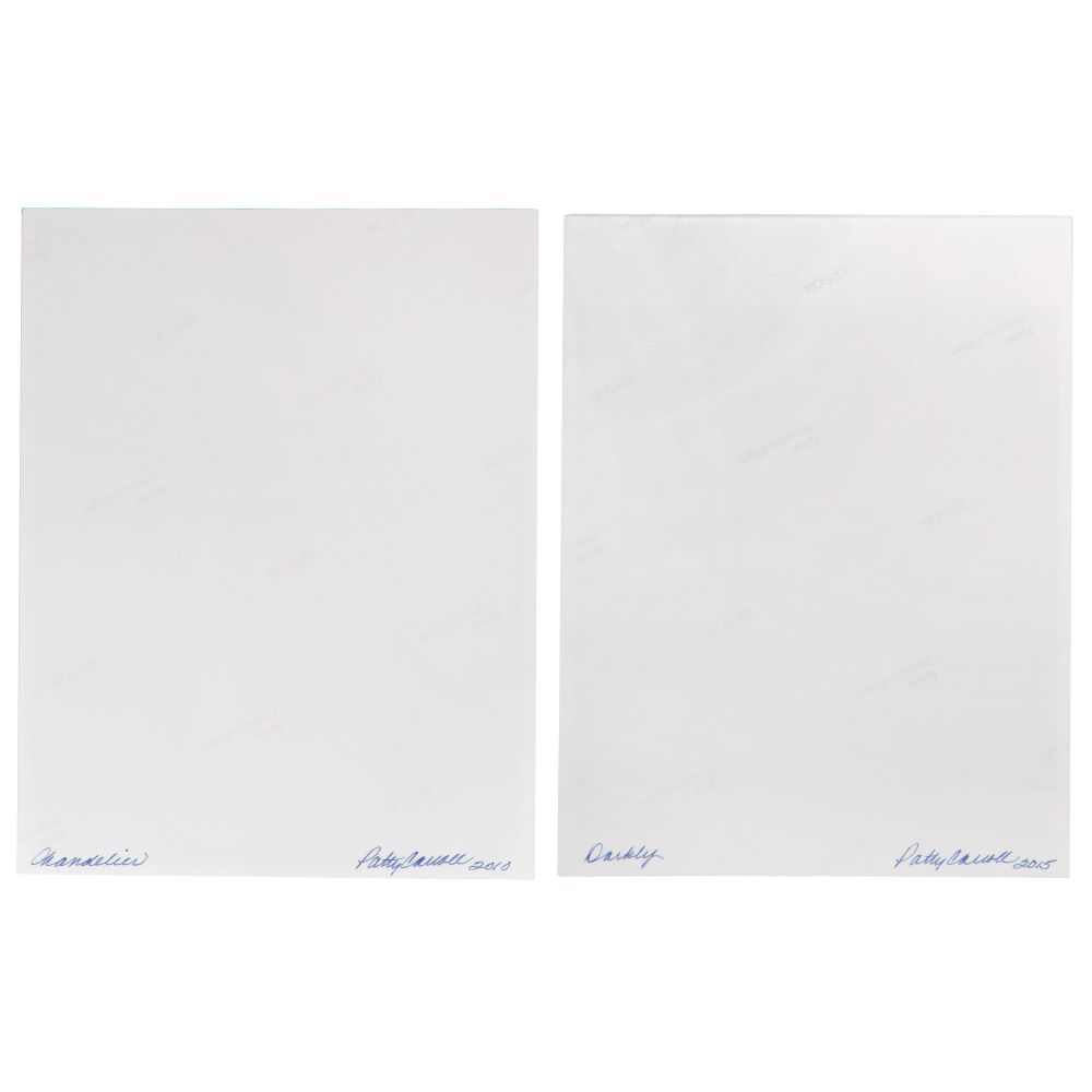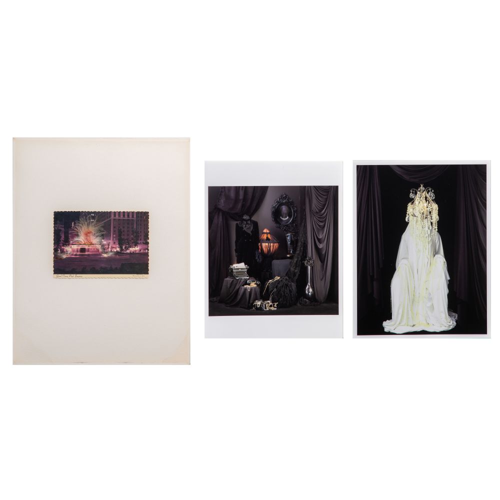 (3) total items including a black and white “Chandelier”, dated “2010” and ink signed verso, depicting a draped figure wearing a chandelier, prefiguring her later “Anonymous Woman: Draped Series” and a color cibachrome print “Darkly”, dated “2015” and ink signed verso, 8 x 8-inch image depicting items (some draped) on draped supports in a draped room, both on loose sheets; together with a color postcard of “The Grand Circus Park Fountain” altered by the addition of a feather glued onto the fountain, mounted to 14 x 11-inch board