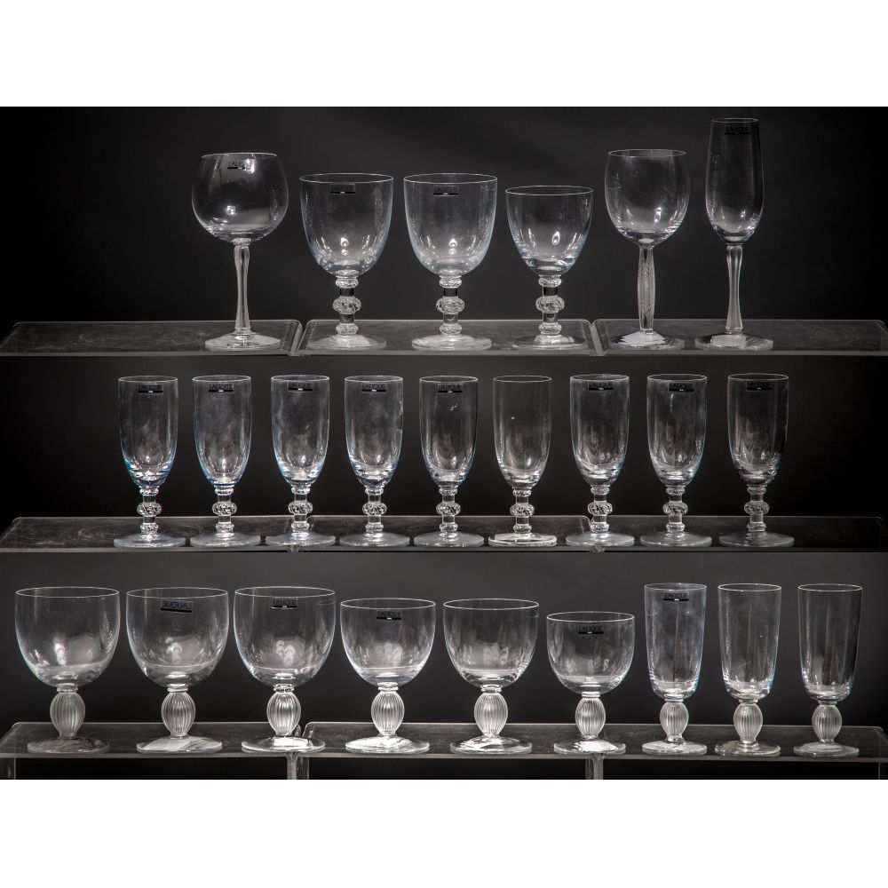 (24) items including in the Langeais pattern (3) champagne flutes, (3) tall water goblets, (2) regular water goblets and a burgundy wine, in the Saint Hubert pattern (9) champagne flutes, a regular water goblet and (2) tall water goblets, in Royal pattern a champagne flute and a red wine and in the Diamond pattern a water goblet
