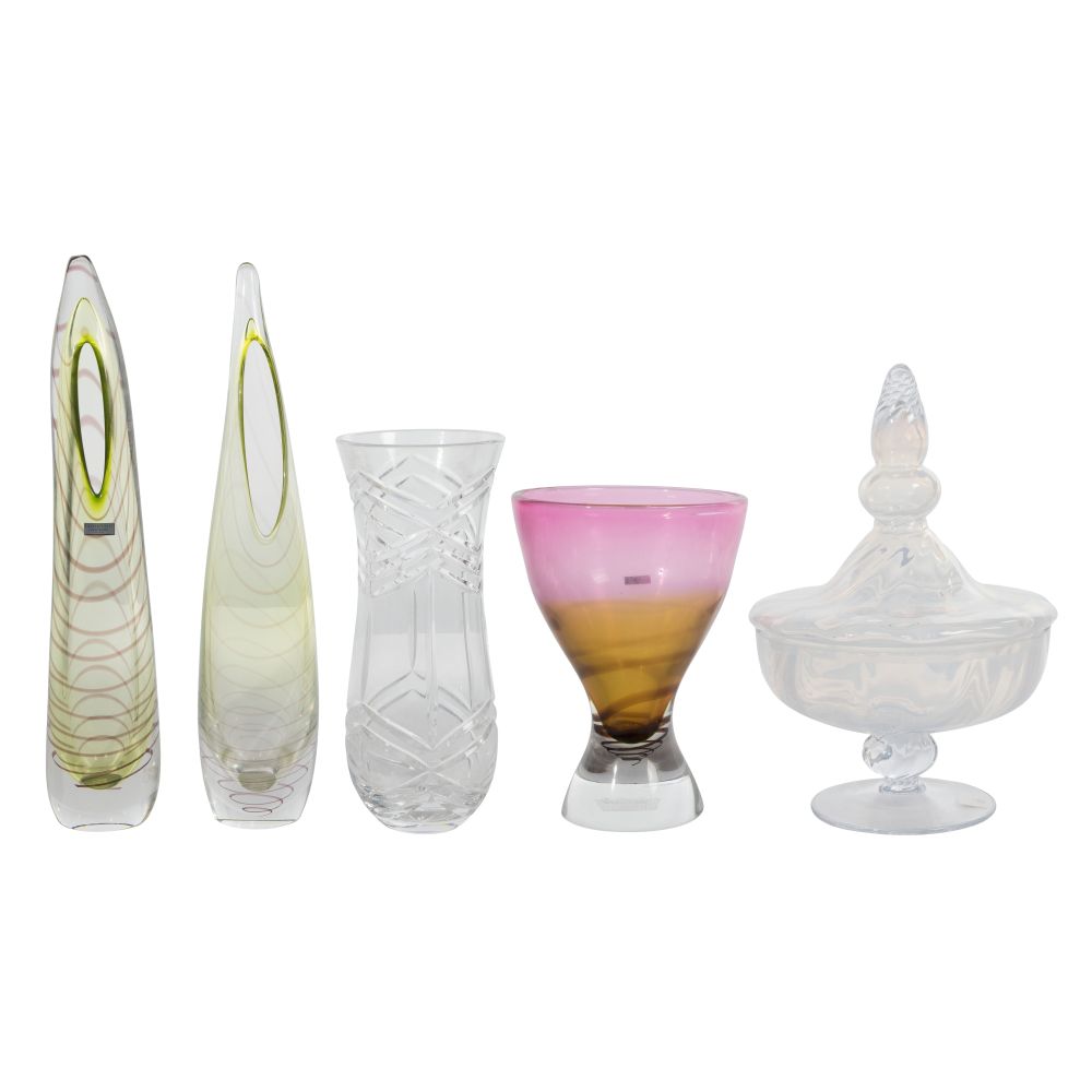 (5) total items including (3) vases and a lidded compote with box; together with a clear crystal vase