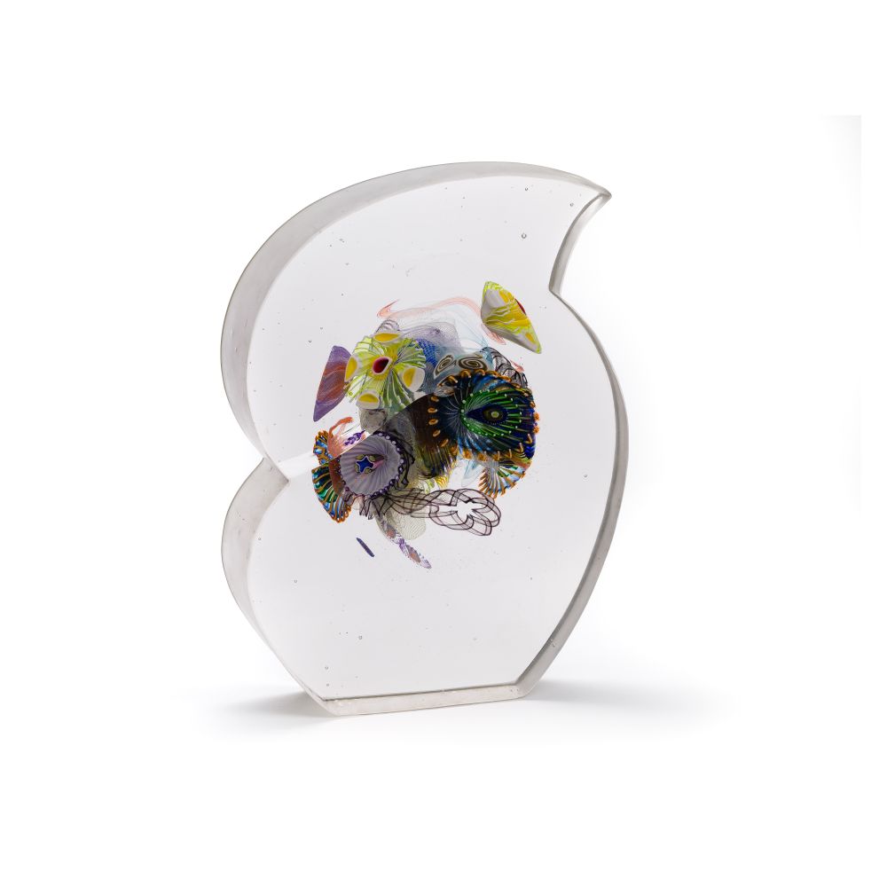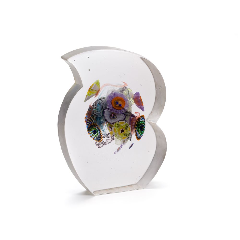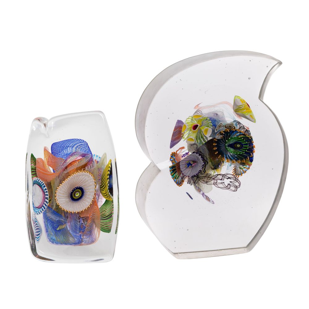 (2) total items including an undated, engraved signature underside, slab form having cane millefiori and latticino elements; together with a solid clear crystal case in an organic form having a sculptural interior of various canes
