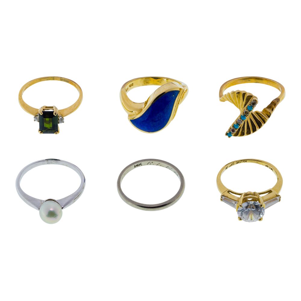 (6) items including a dark blue stone, a row of alternating round cut diamonds and Persian turquoise balls, an emerald cut dark green gemstone flanked by round cut diamonds, a round cut crystal flanked by baguettes and, in white gold, a pearl and a band (all marked “14k” / “585”)