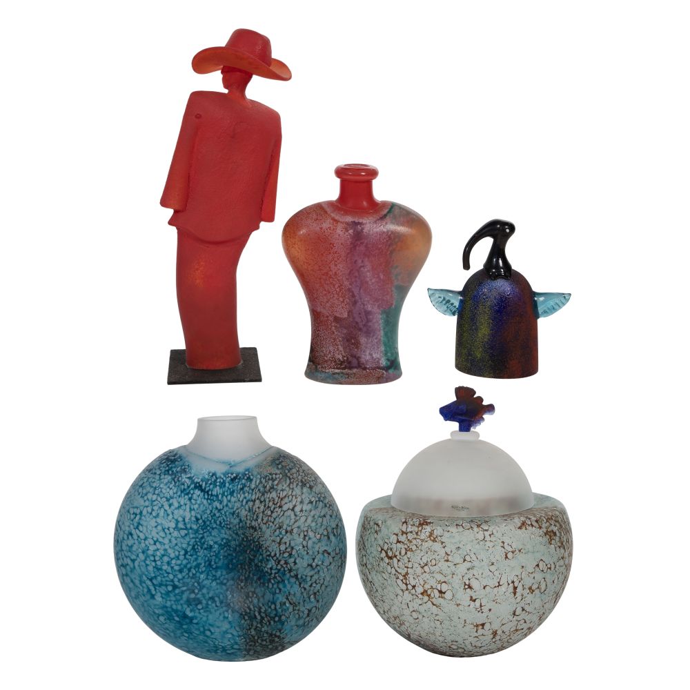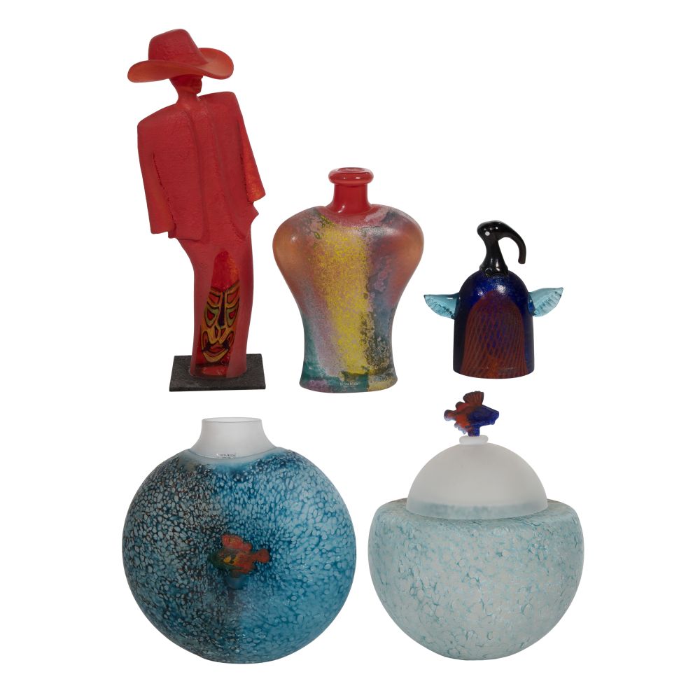 (5) items of various colors including a figural sculpture, an avian form, a broad-shouldered bottle vase, a compressed globular form vase and a covered jar having a fish form finial, some having engraved marks underside, some retaining Kosta Boda labels
