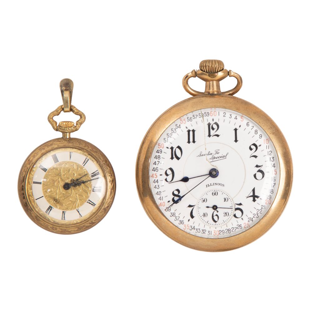 Condition: overall light wear consistent with normal use, railroad watch having cracked crystal, dial having small crack near 8, winding and running when tested, pendant watch having skewed dial, not running, wrist watch not running, overall light wear consistent with normal use, railroad watch having cracked crystal, dial having small crack near 8, winding and running when tested, pendant watch having skewed dial, not running, wrist watch not running