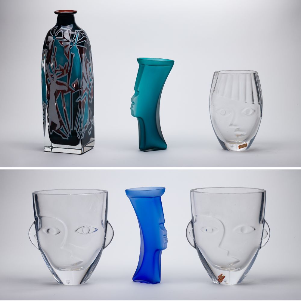 (6) total items including a “Nefertiti” and (2) “Ramses” crystal face vases by Martti Rytkonen and a bottle vase by Helen Krantz for Orrefors; together with (2) stylized profile vases by Janusz Pozniak