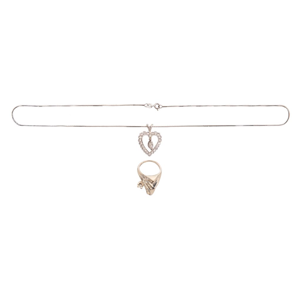 (2) items including a ring having a solitaire round cut diamond flanked by three rows of diamond accents and a diamond heart pendant on necklace (marked “14k”)