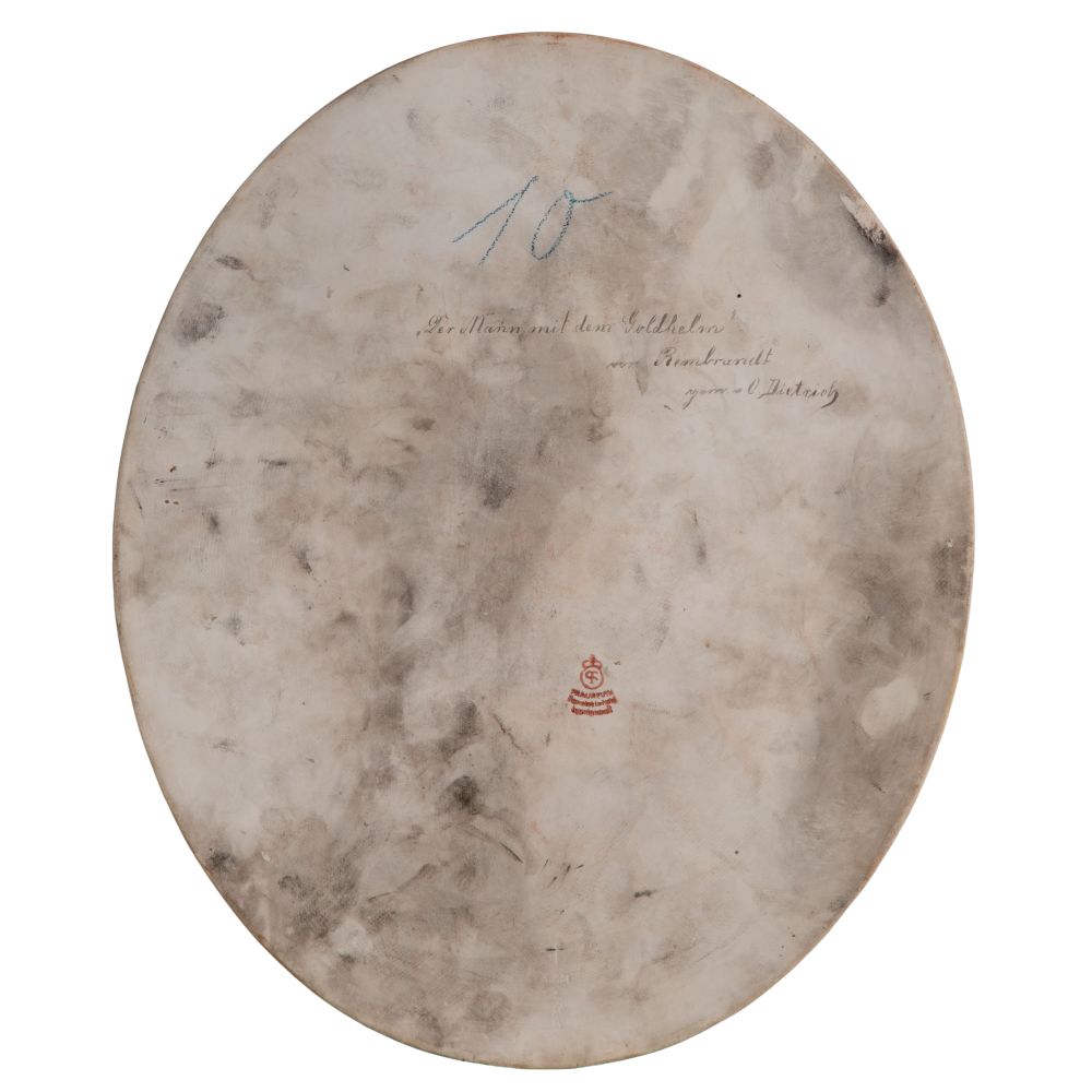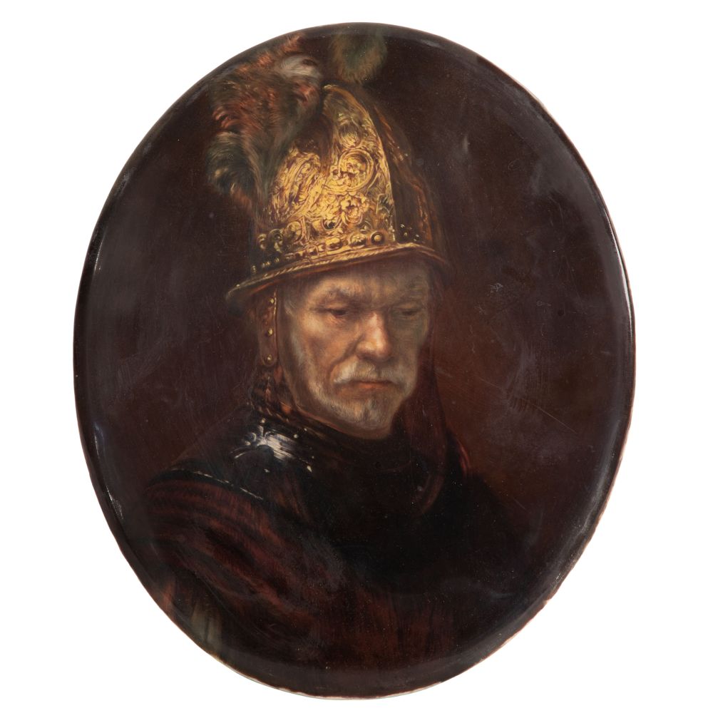 Undated, unsigned, painted plaque depicting “The Man with the Golden Helmet” after Rembrandt, having German inscription verso citing painter as Oskar Dietrich, unframed