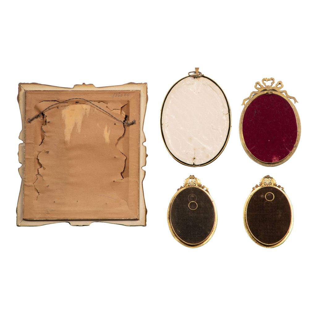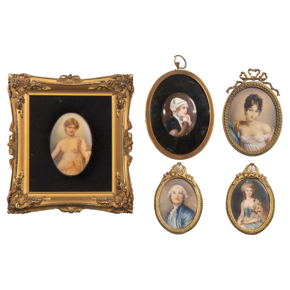 (5) oval format items, unsigned including a female nude holding a string having a velvet lined gold-tone gesso on wood frame and (4) portraits behind convex glass in brass frames