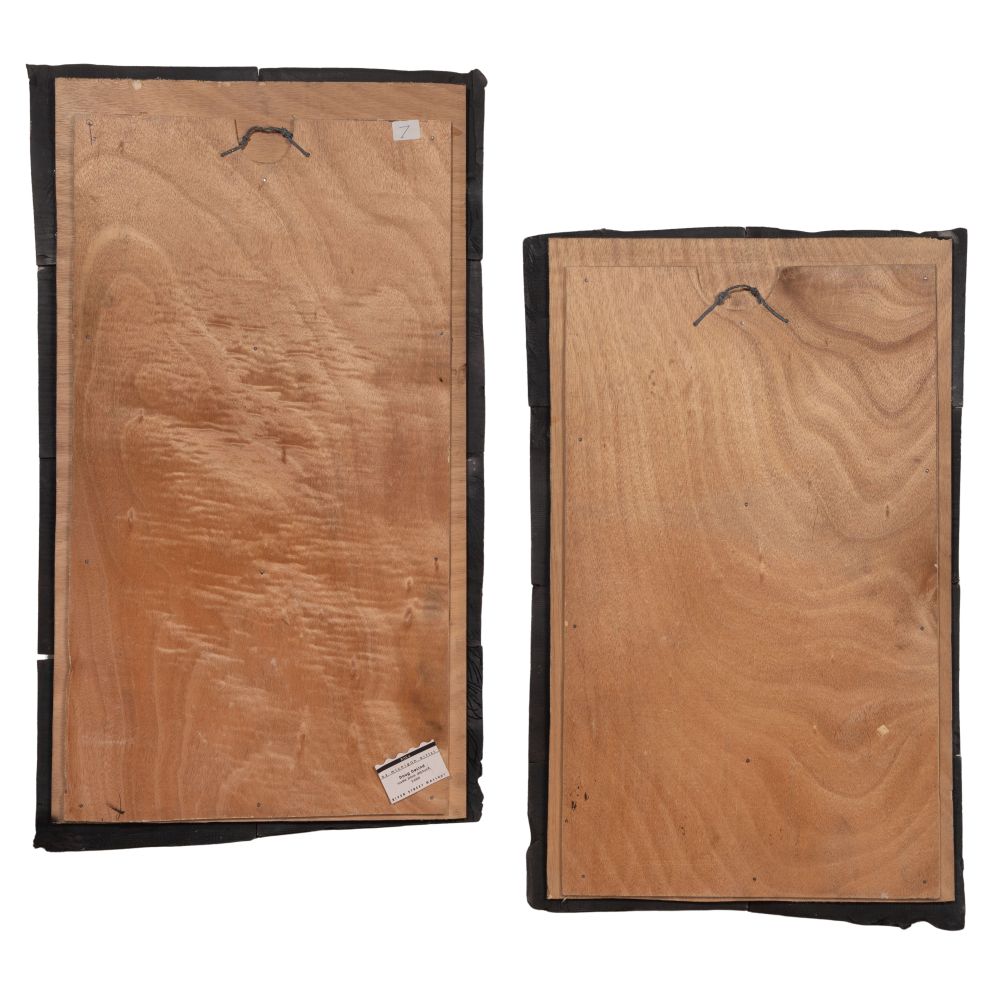 Raku pottery tiles mounted to wood backing, two pieces forming a diptych, signed lower left and having a River Street Gallery label verso