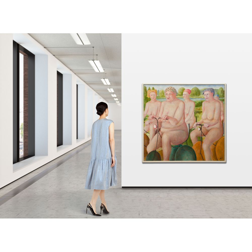 2001, signed and dated, depicting Rubenesque nudes on tricycles, having a painted wood frame
