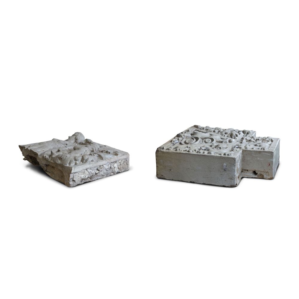 (2) items including a keystone shaped slab depicting an acanthus motif and a partial slab depicting cherubs