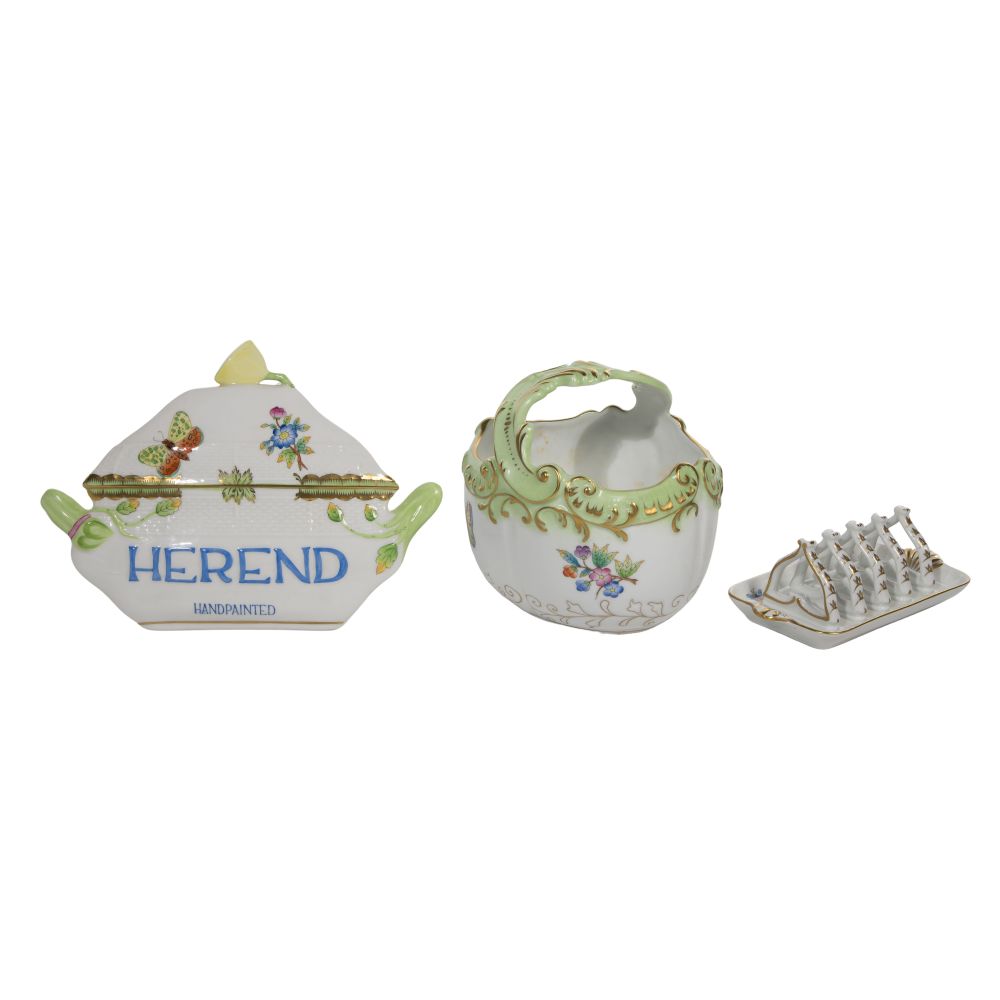 (3) items including a #450 toast rack, a #7461 basket, both marked on the underside and a teapot advertising sign