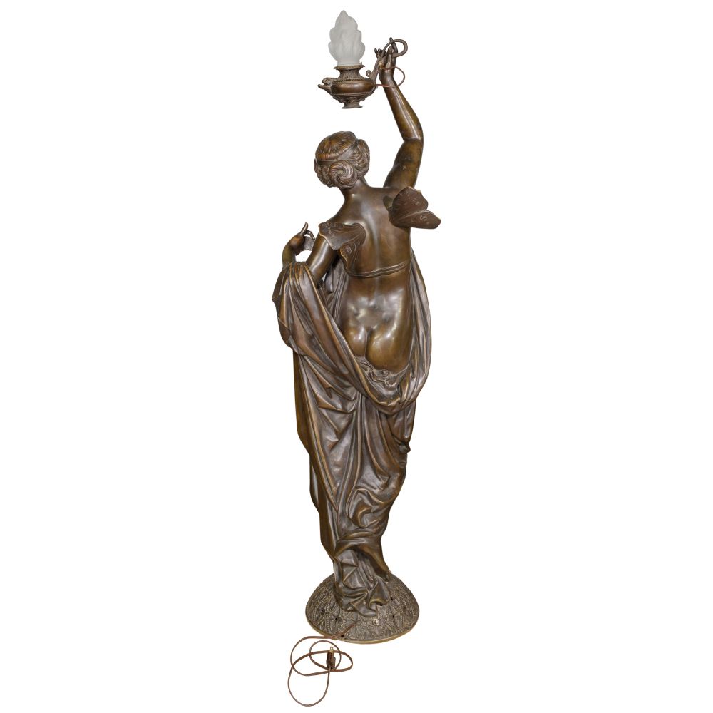 Depicting a draped female figure holding a lamp with glass shade, unmarked