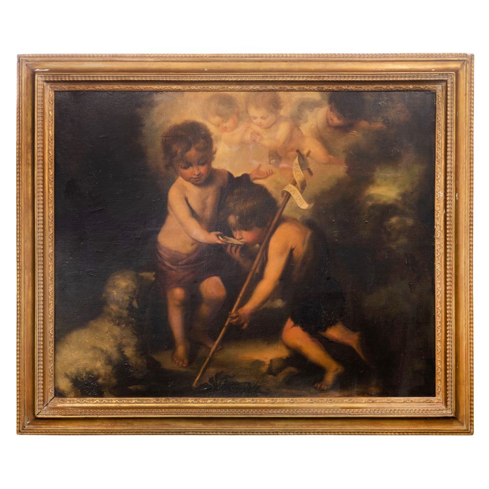 A 19th century copy of the 17th century depiction of Jesus and John the Baptist as children, having an old paper label reading “Museo Nacional / De Pintura Y Esculture / Numero de la copia 423” indicating it is an official copy produced of the original at the Prado, in a gold-tone gesso on carved wood frame