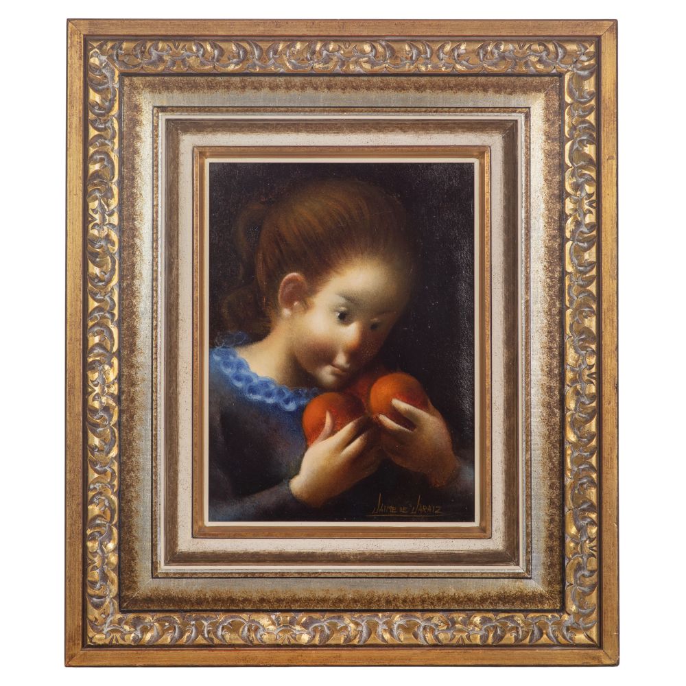 Undated, signed, depicting a girl holding fruit, in a gold-tone gesso wood frame, including an artist biograph booklet and bill of sale
