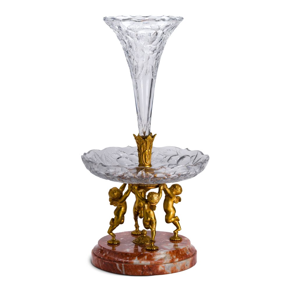 Three-piece construction having a screw-on vase holding the plate to the brass putti mounted marble base