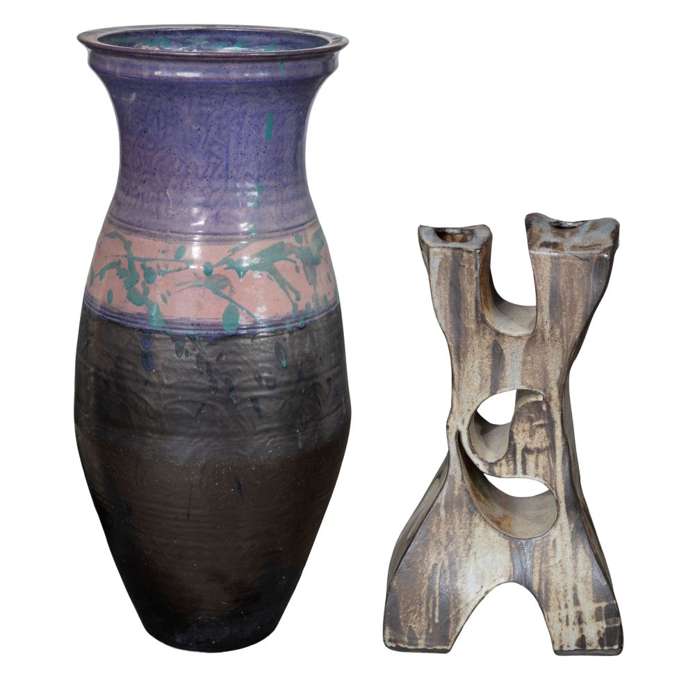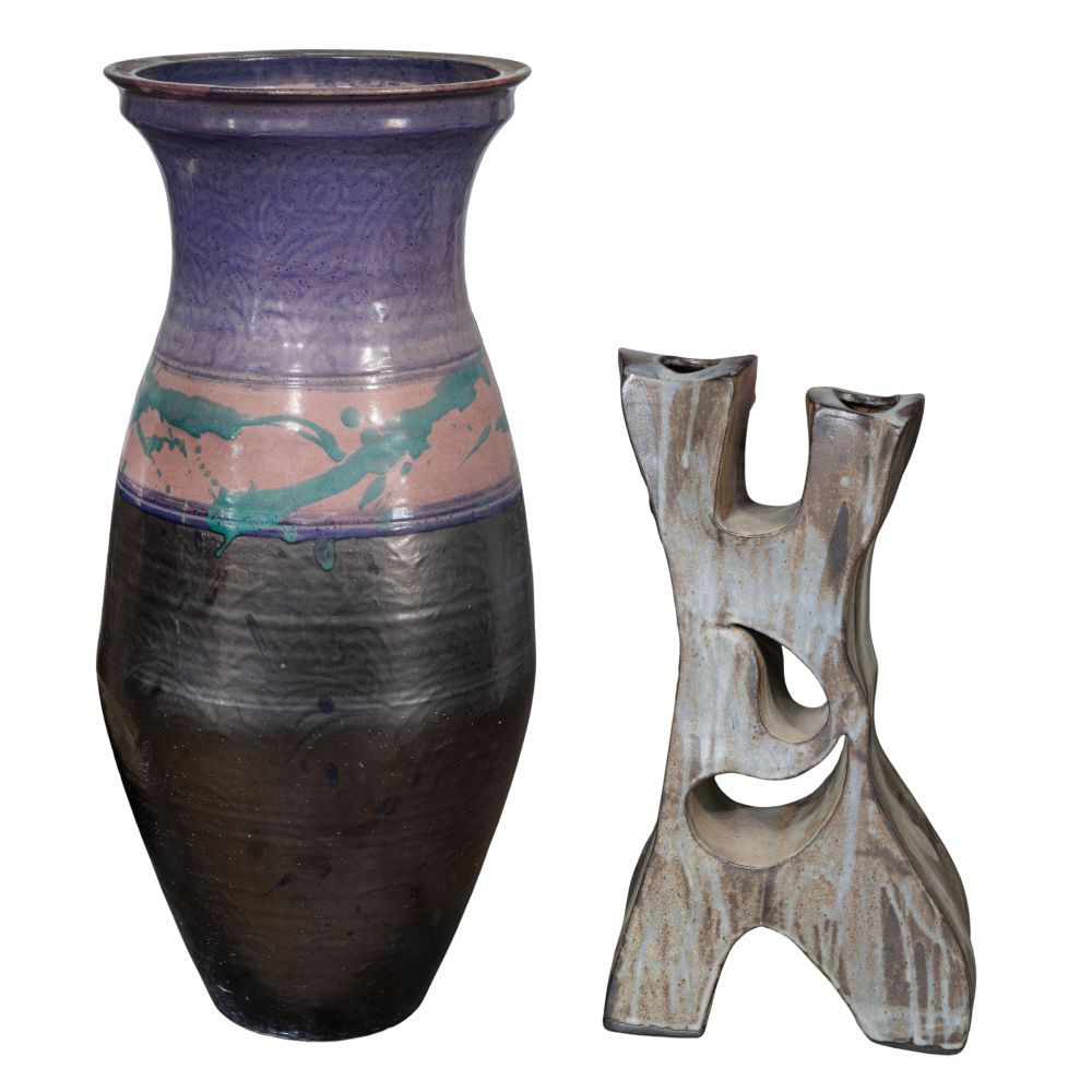 (2) floor vases, one having a purple and black glaze, illegibly signed on underside as well as a double vase having a yin and yang motif