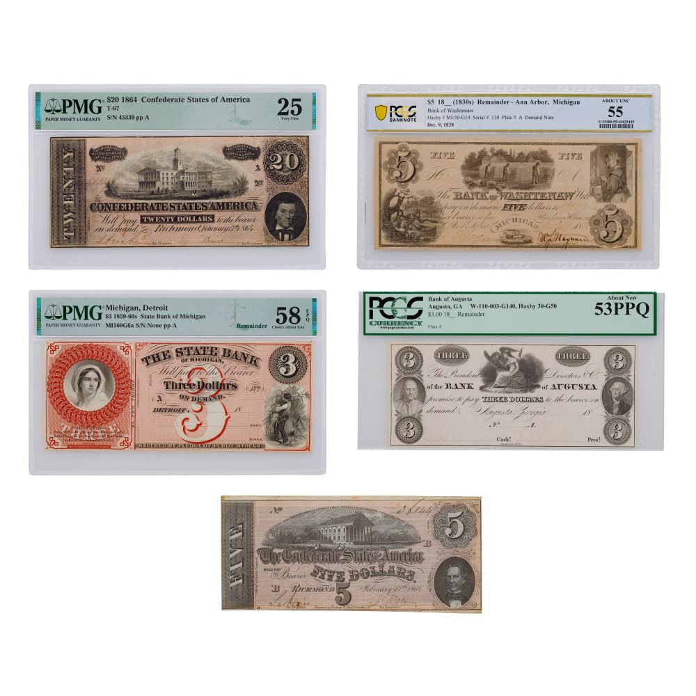 (5) notes including 1864 $20 Confederate VF-25 PMG, 1864 $5 Confederate, Bank of Augusta AU-53 PPQ PCGS, State Bank of Michigan AU-58 EPQ PMG, Bank of Washtenaw AU-55 PCGS