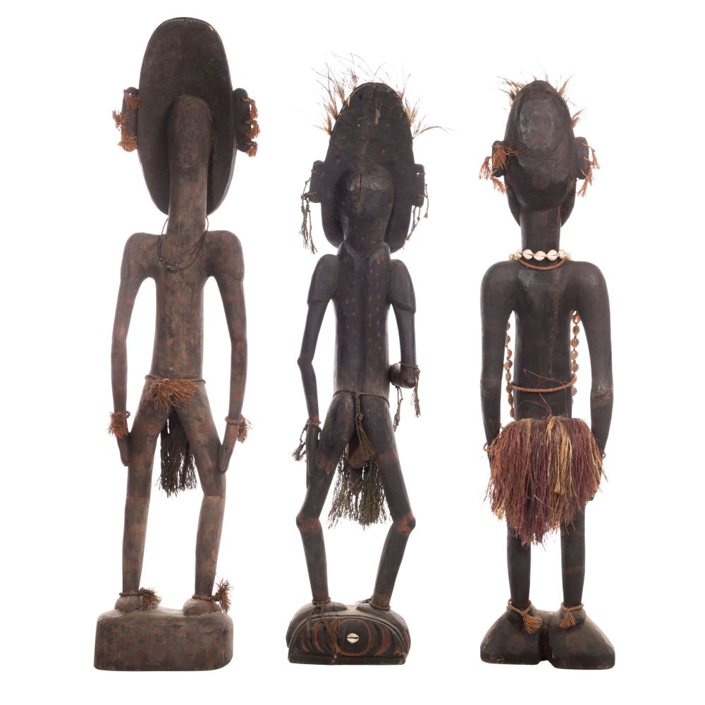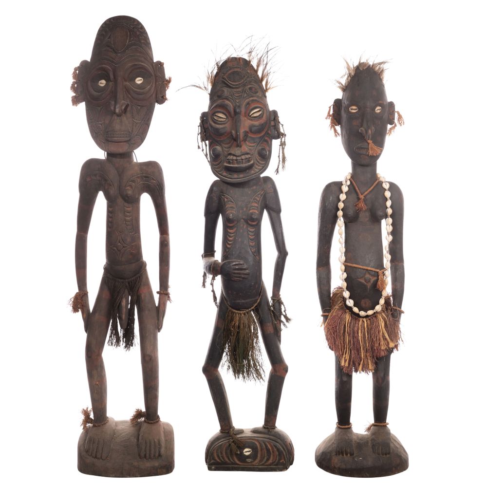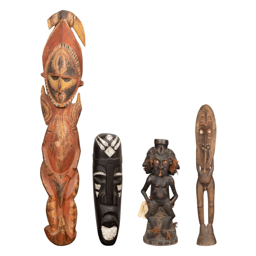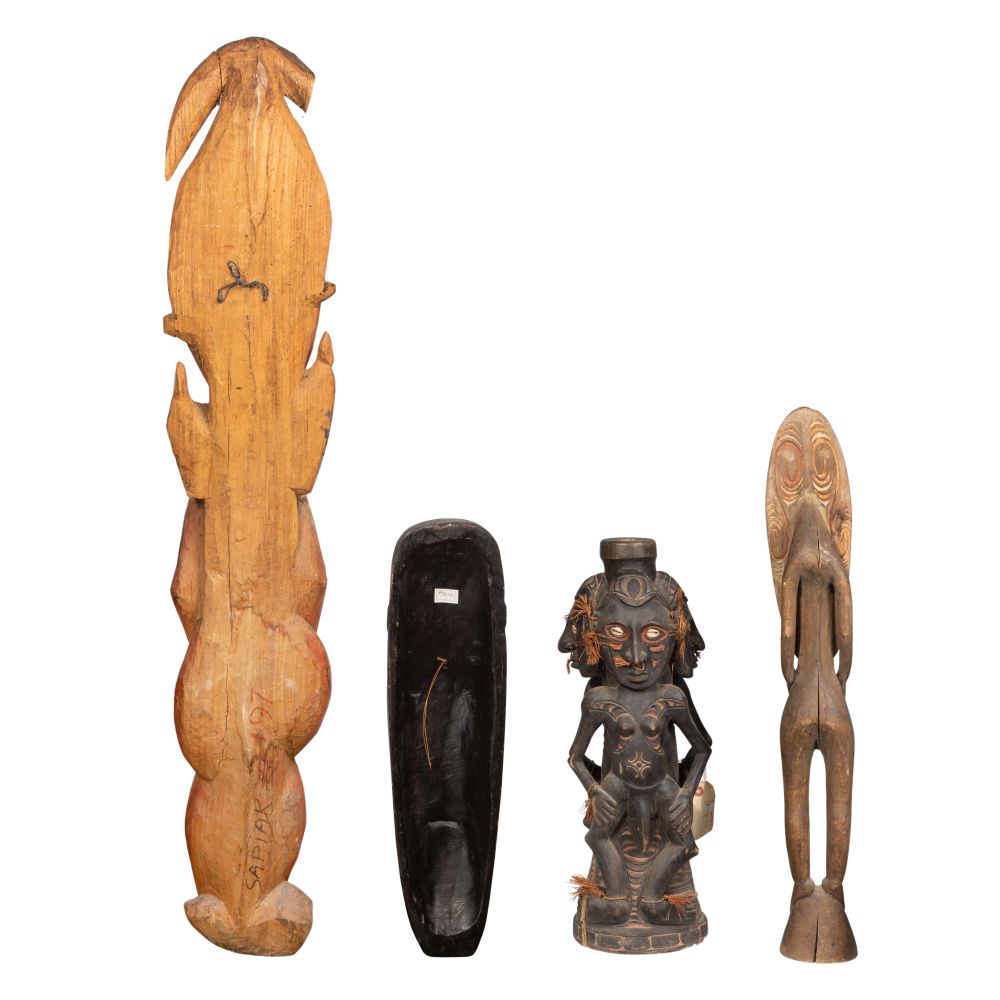 (7) items including Papua New Guinea Wood Sculpture Sepik River style having cowrie shell and fiber attachments, including a male and (2) females having feathered headdresses as well as (2) carved fertility figures, a painted wall hanging and a mask