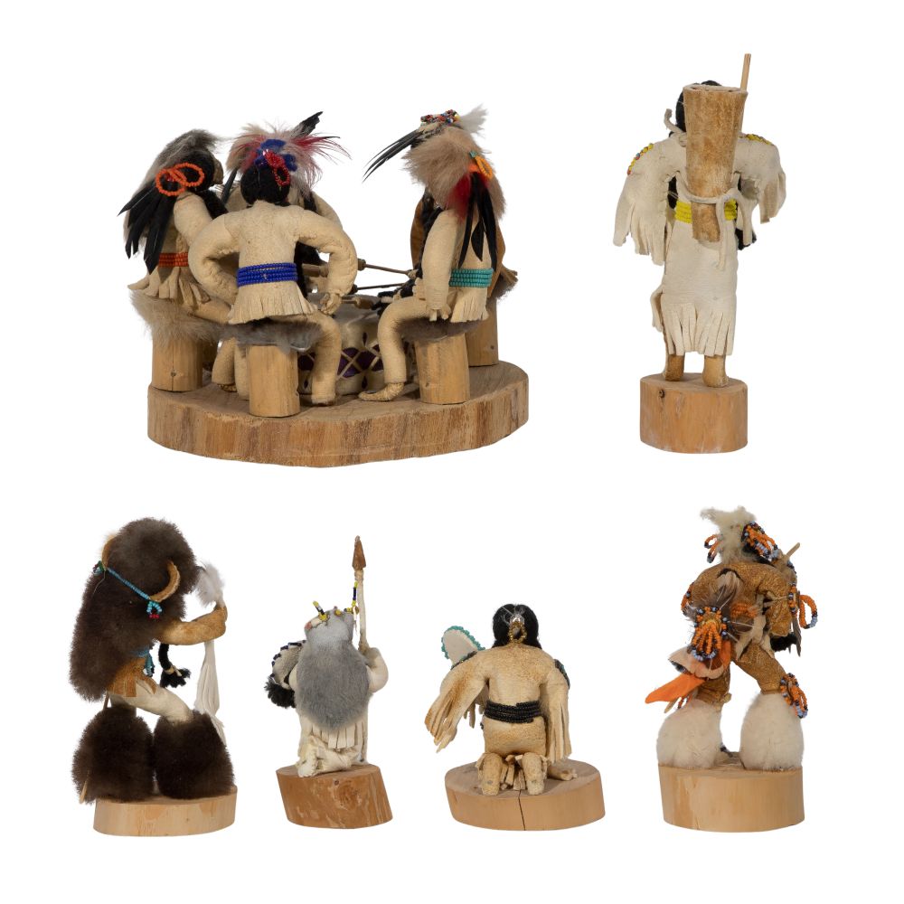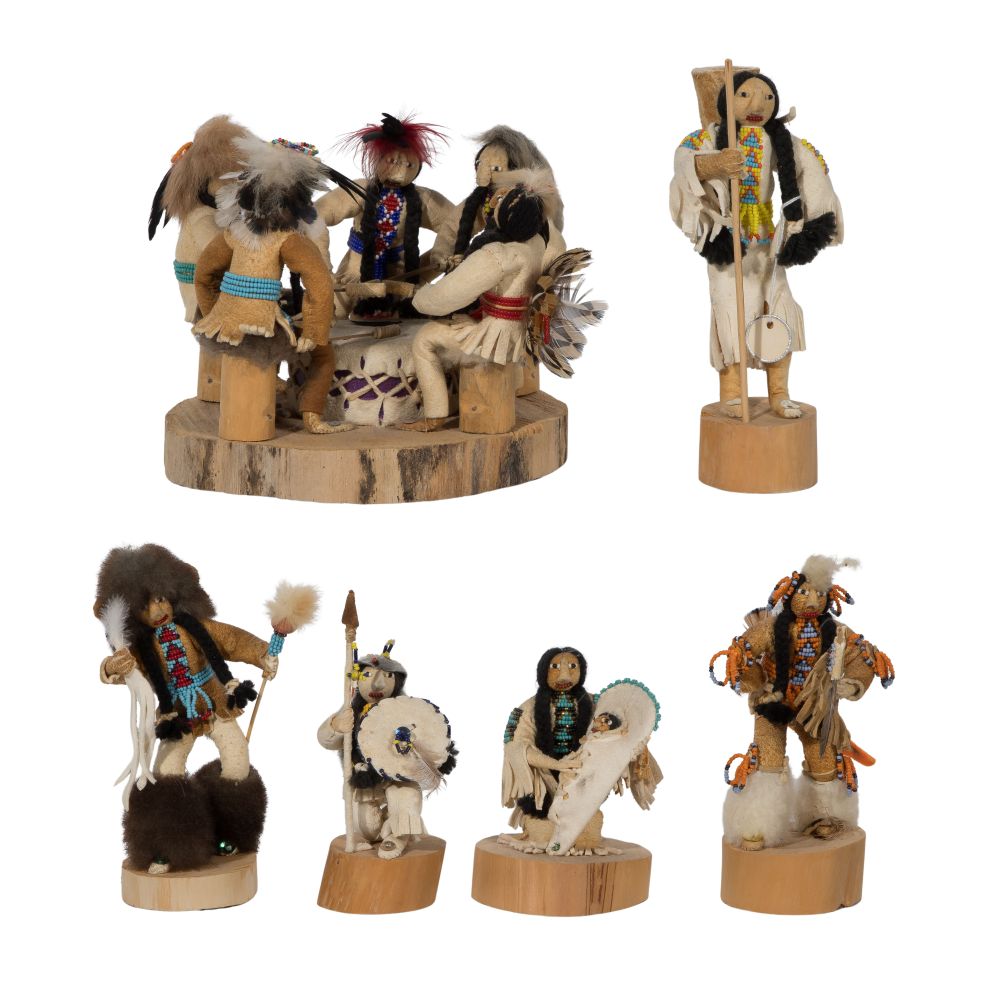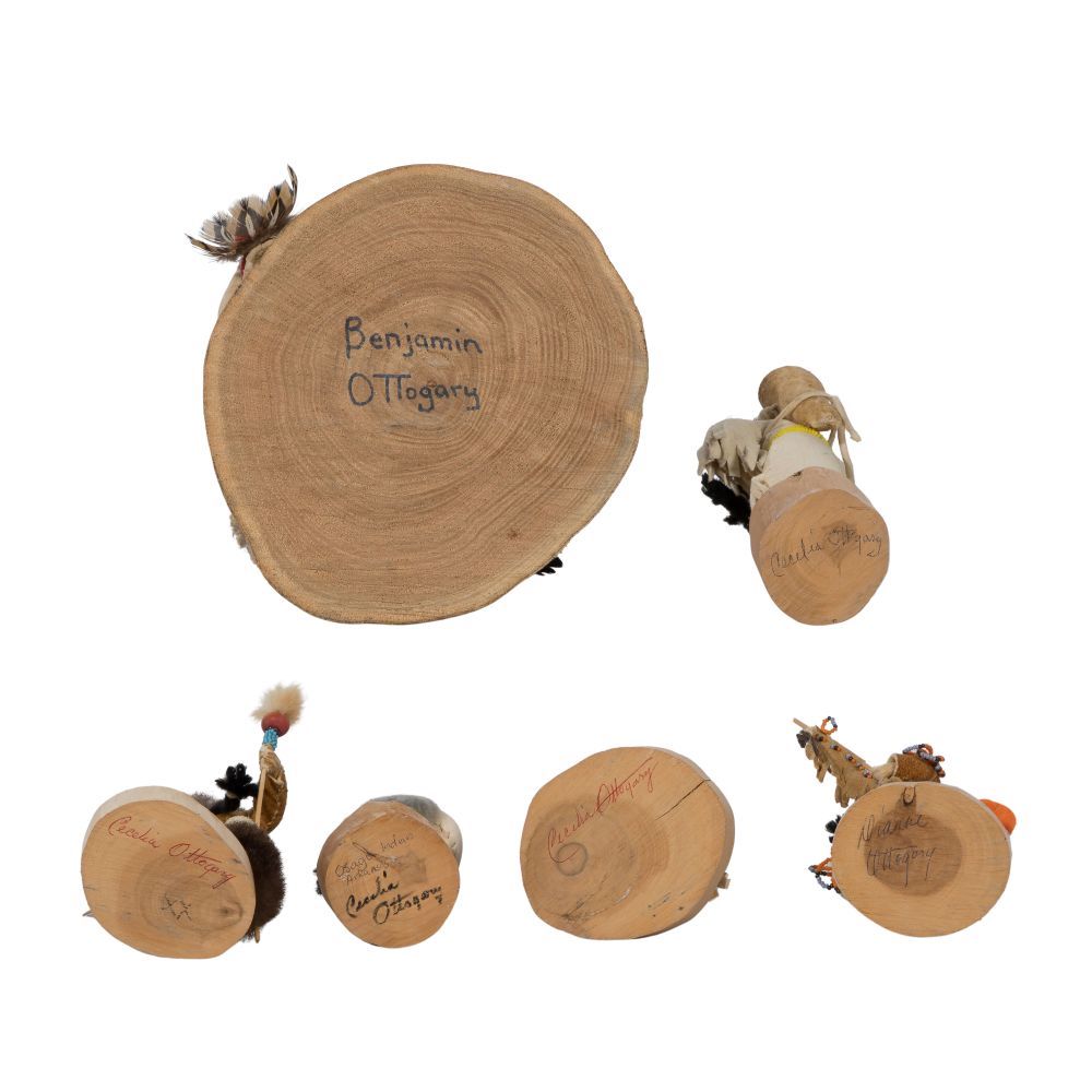 (6) items, all beaded hide covered wood on wood bases, having beaded facial features and feather and fur attachments, (4) ink signed “Cecelia Ottogary” underside, a grouping of five drummers signed “Benjamin Ottogary” and a signed “Dianne Ottogary”