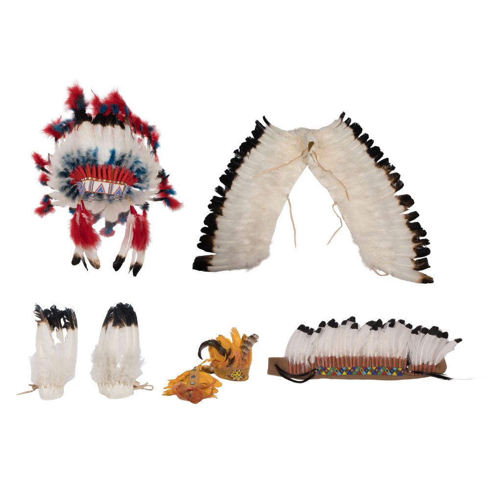 (6) items including a headdress having brightly dyed feathers and loom-woven beaded headband, a headdress and (2) arm bands having black-tipped white feathers, a small size headdress having beadwork and a single armband having a feathered and beaded drop