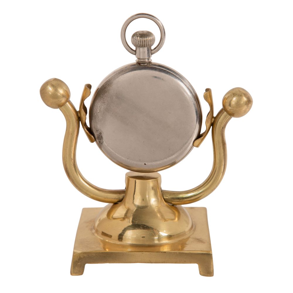 Having a silverplate case and paper dial spelling “Cattle Loans”, subsidiary dial for seconds, brass stand and attached brass bull fob on watch chain