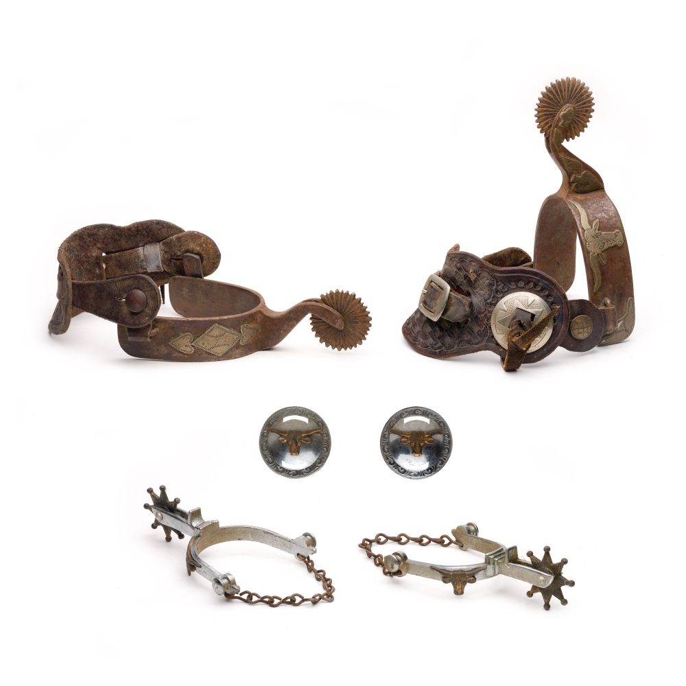 (2) pairs including a wrought iron having applied brass playing card suit pips to shanks and engraved geometric and steer head shaped mounts to heel band, tooled leather straps having conchos, as well as a plated brass having applied cast brass steer heads to band and to conchos (detached from missing straps), 8-point rowels having ball tips, heel chains